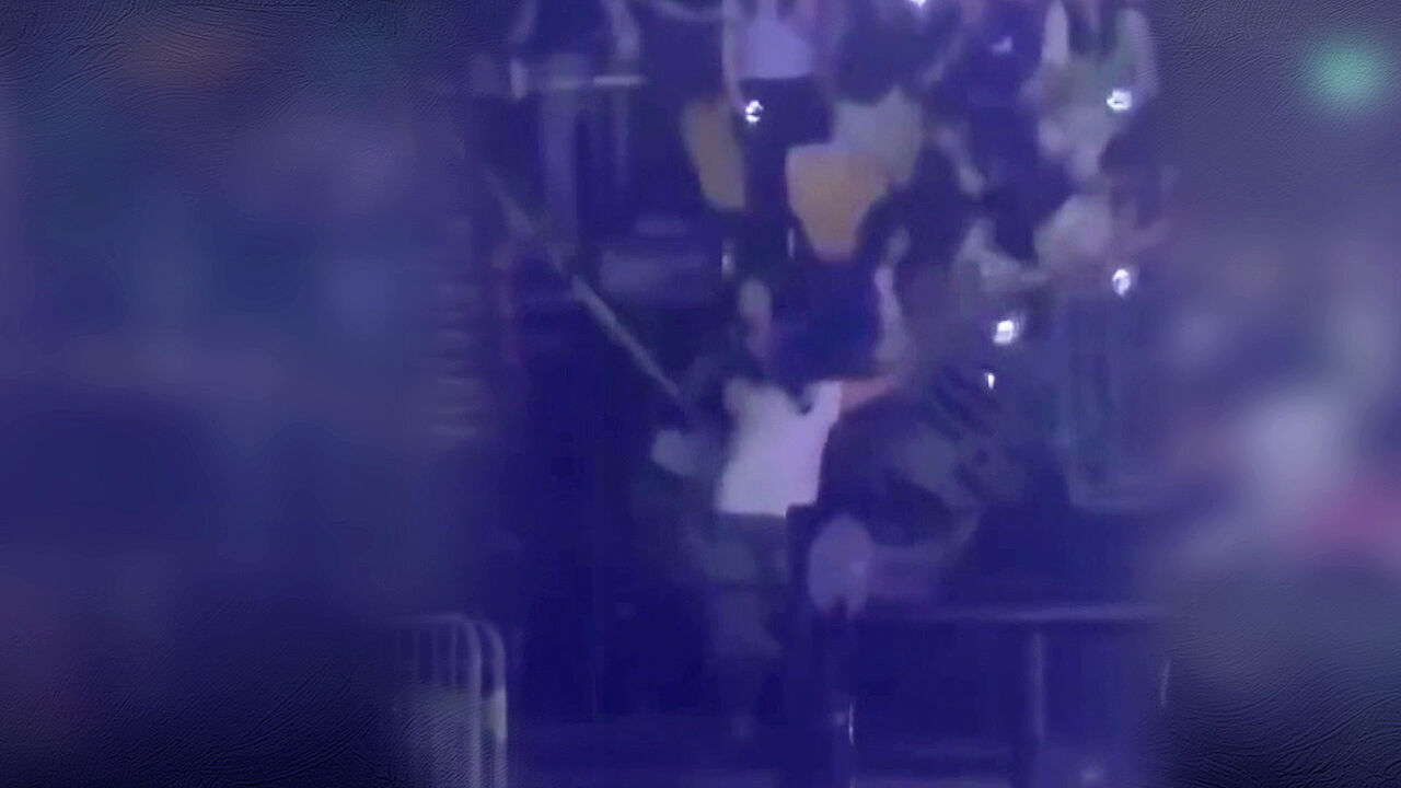 한 멤버가 손을 흔들자 관객들이 몰려들더니, 갑자기 펜스가 무너지며 관객들이 떨어집니다.