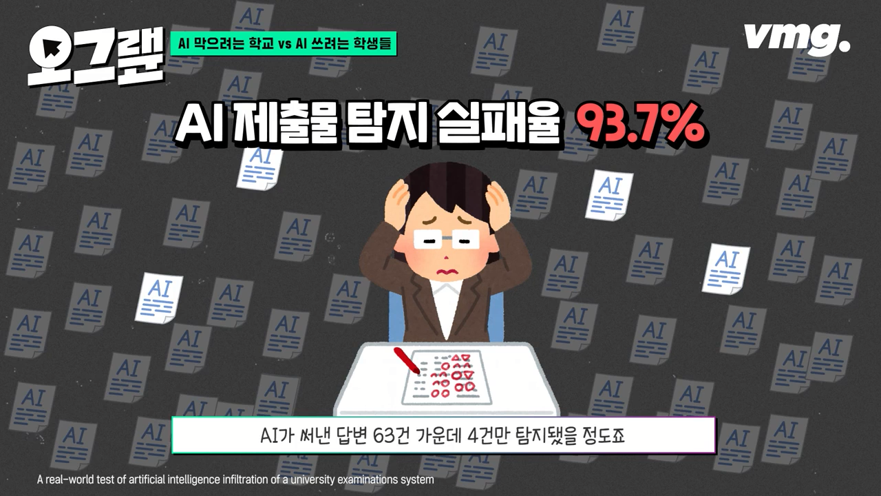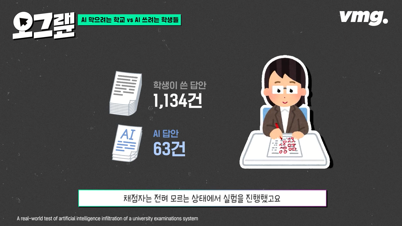 실험 결과 AI 제출물을 정확히 탐지하는 건 거의 불가능에 가까운 것으로 나타났어요. AI가 써낸 답변 63건 가운데 4건만 탐지됐을 정도죠. 채점하는 사람이 '아 이건 AI가 만든 거다'라고 직접 표기한 경우는 단 2건에 불과했어요.