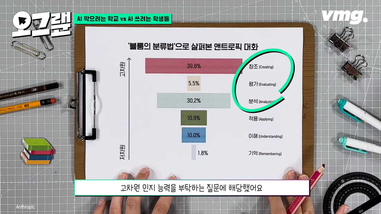 고차원 인지 기능이라고 할 수 있는 창조, 평가, 분석과 관련된 작업의 AI 처리 비율이 높은 상황입니다. 창조 영역이 전체 질문의 39.8%, 분석이 30.2%를 차지하고 있어서 전체 질문 10개 중 7개는 고차원 인지 능력을 부탁하는 질문에 해당했어요. 그래서 많은 전문가들은 이렇게 학생들이 고차원 인지 능력을 AI에 맡긴다면 사고 발달이 원활하게 이뤄지기 어렵다고 경고하고 있는 거죠.