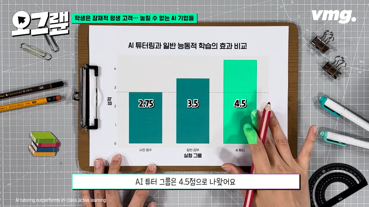 AI 튜터링을 진행한 학생들의 시험 결과가 스스로 공부한 학생들보다 더 높게 나온 겁니다. 사전 점수 2.75점과 비교했을 때 일반적인 방법으로 공부한 집단은 3.5점, AI 튜터 그룹은 4.5점으로 나왔어요.