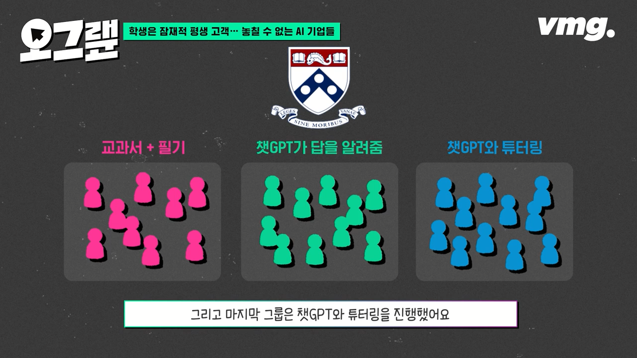 다른 연구에서도 비슷한 실험 결과가 나왔습니다. 펜실베이니아 연구팀이 진행한 실험인데요, 이번엔 그룹을 3개로 나눠서 진행했습니다. 첫 번째 그룹은 교과서와 필기로 공부했고, 두 번째 그룹은 챗GPT가 그냥 정답을 알려줬습니다. 그리고 마지막 그룹은 챗GPT와 튜터링을 진행했어요.