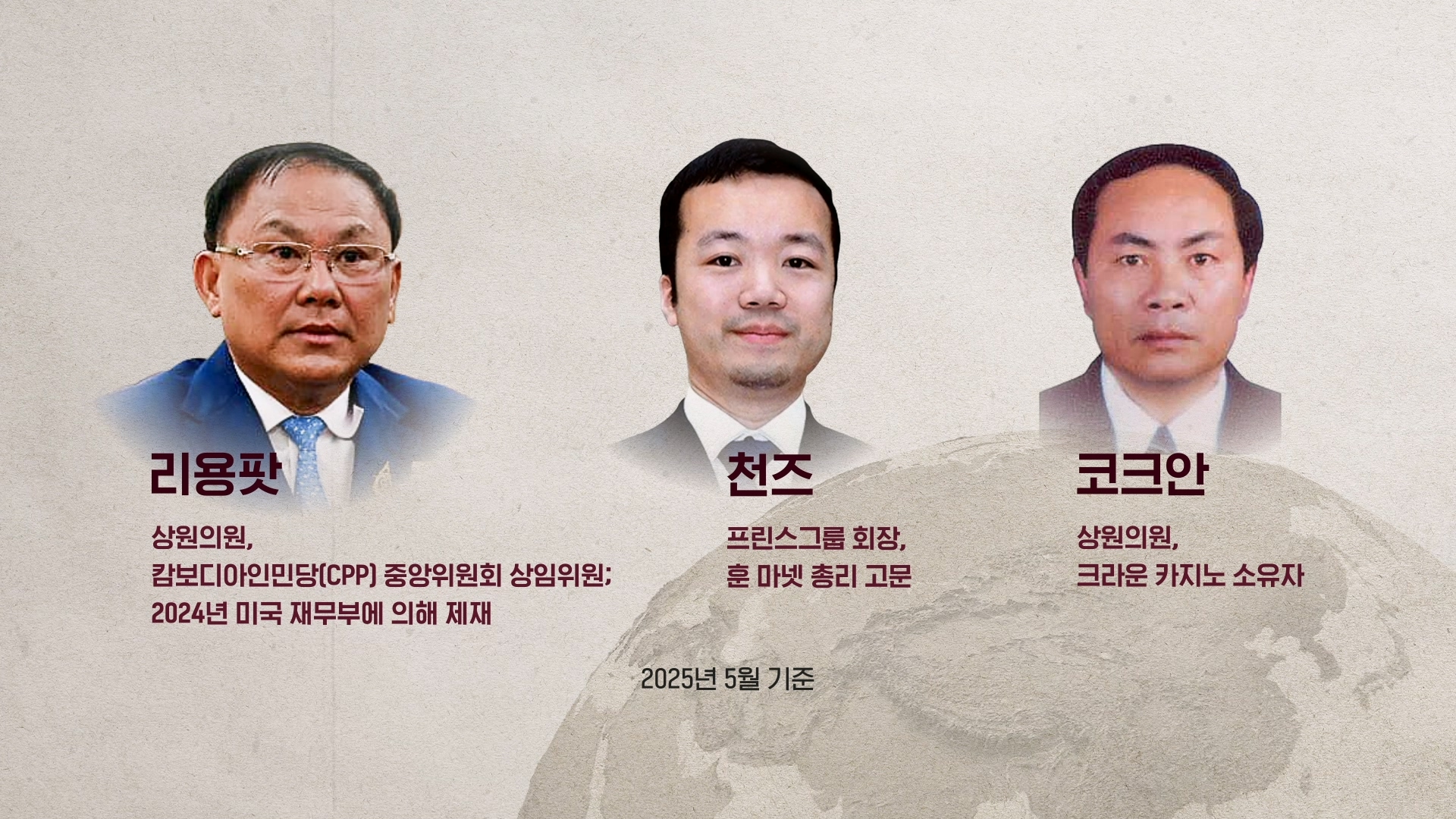 삼 랑시 전 대표가 저희와의 인터뷰에서 언급한 인물은 3명인데요. 리용팟, 천즈, 코크안, 이 세 인물은 지난 5월 인권·정책 연구기관 휴머니티리서치컨설턴시(HRC) 보고서에서 제시한 사기 산업 관련 인물들과 일치했는데요. 이 외에도 보고서에서는 다양한 인물들, 특히 훈센 전 총리와의 측근들이 핵심 인물들로 지목이 됐습니다.