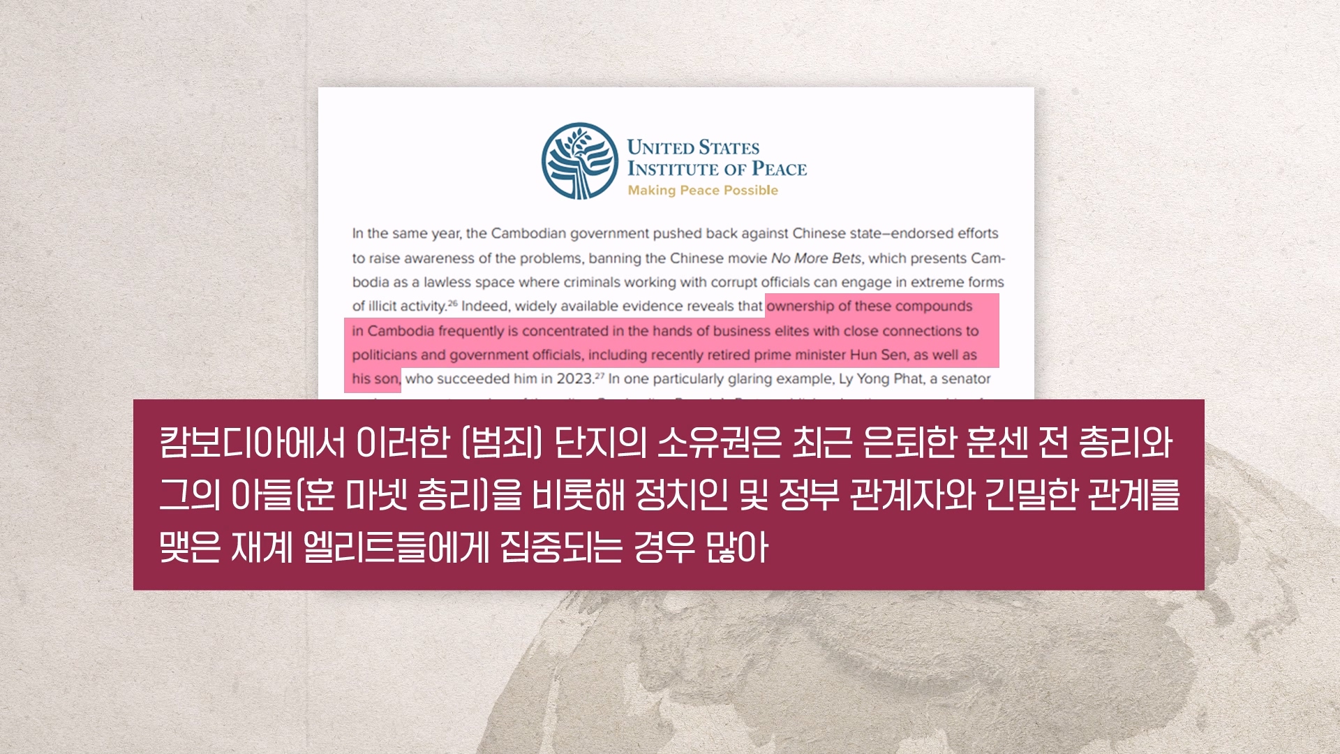 미국 싱크탱크 미국평화연구소의 지난해 5월 보고서에서는요. 캄보디아에서 이러한 범죄 시설의 소유권은 훈센 전 총리와 또 그의 아들 훈 마넷 총리를 비롯해서 정치인, 또 정부 관계자와 긴밀한 관계를 맺은 재계 엘리트에 집중되는 경우가 많다라고 분석했습니다.