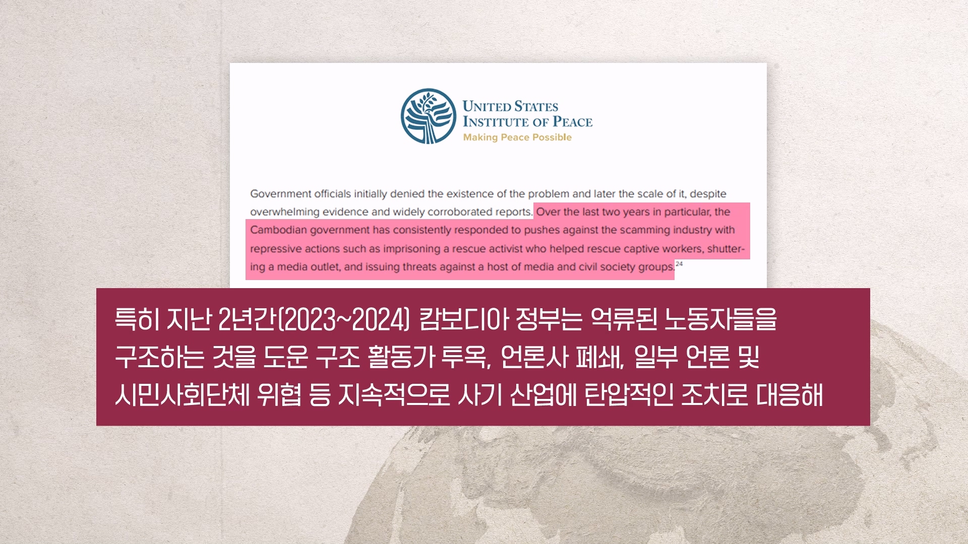 또 지난 2023년부터 지난해까지 2년간 캄보디아 정부는요. 인신매매 피해자들을 구출하는 데 도움을 준 구조 활동가를 상을 주기는커녕 투옥을 하고요. 언론사를 폐쇄하고, 시민사회단체를 위협하는 등 탄압적인 조치로 일관해 왔다고도 지적했습니다.