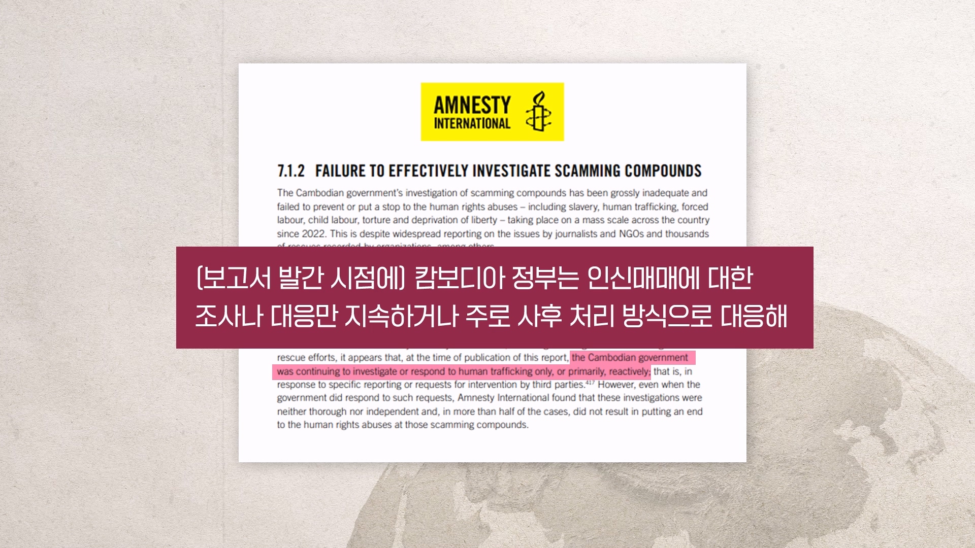 또 국제 앰네스티의 지난 6월 보고서에 따르면요. 보고서 발간 시점에 캄보디아 정부는 인신매매에 대한 조사 대응만 지속을 하고 있었거나, 주로 사후 처리 방식으로 대응하고 있었던 걸로 확인이 되었습니다.
