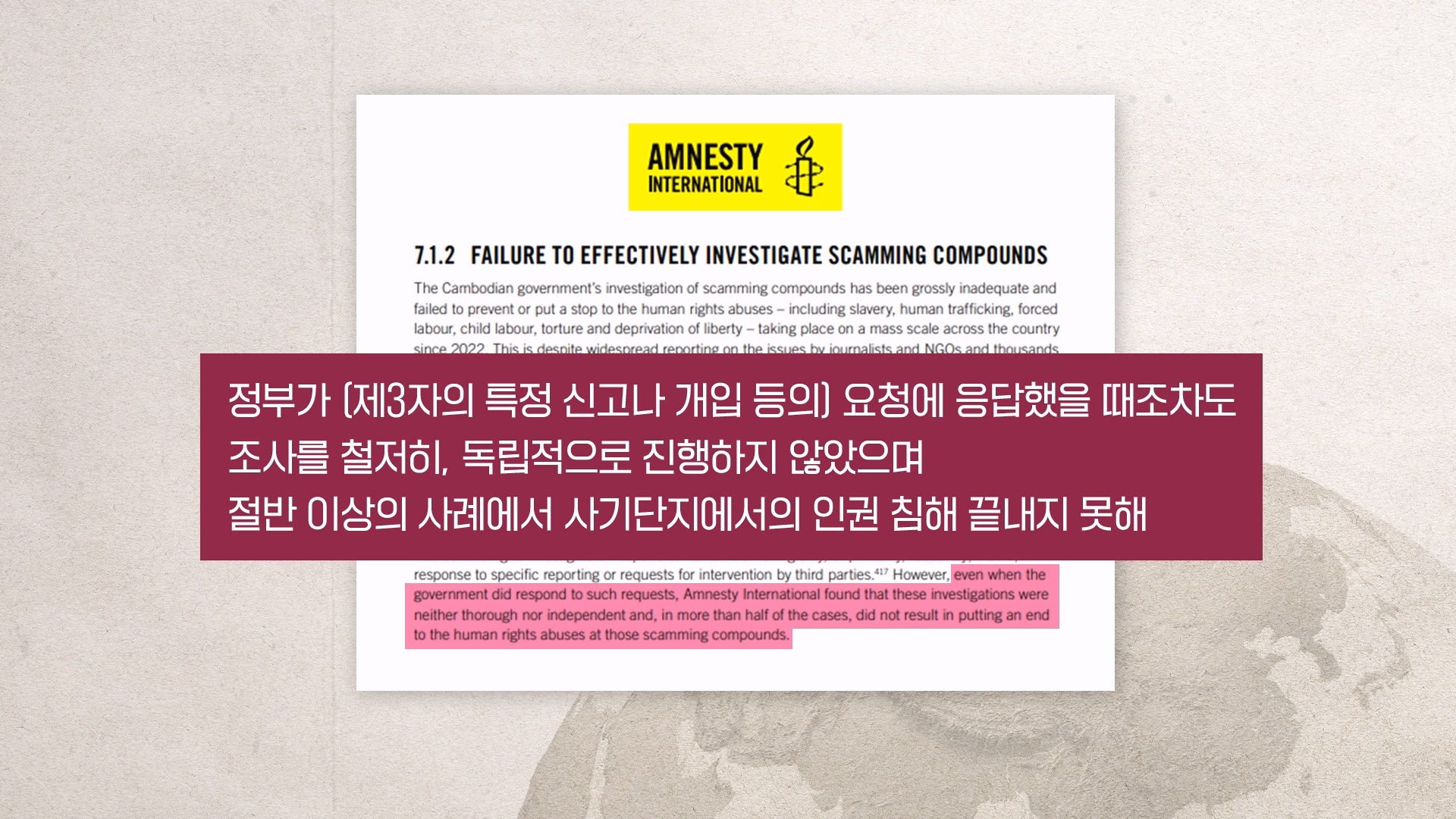 그리고 사후 처리를 하는 과정에서조차요. 보시면 제3자의 특정 신고를 받았거나 또는 개입을 해 달라, 이러한 요청을 받았을 때 그 대응에 있어서 캄보디아 정부가 조사를 철저히 한다거나 혹은 독립적으로 제대로 진행을 하거나 이러지 않았다고, 그리고 절반 이상의 사례에서 해당 사기 시설들에서의 인권 침해를 결국 끝내지 못했다라고 국제 앰네스티가 지적했습니다.