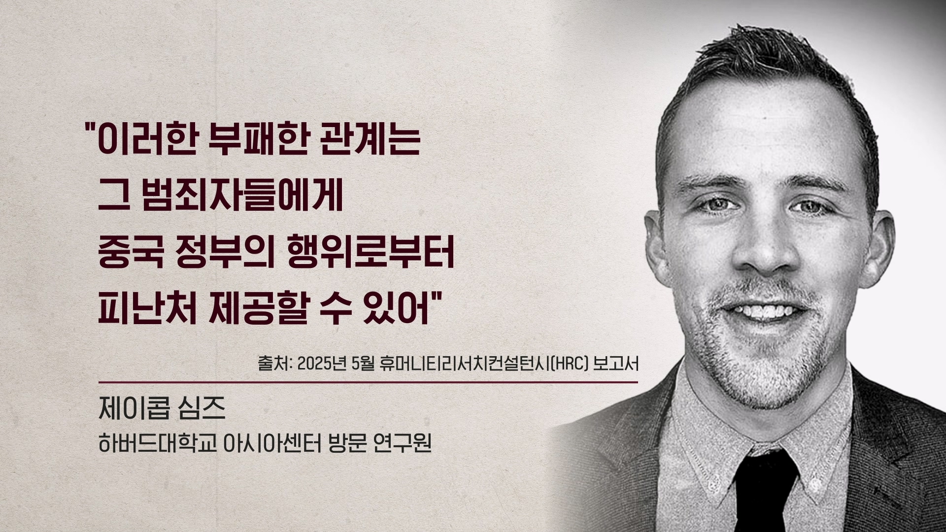 하버드대 아시아센터의 한 방문 연구원은 일부 범죄 조직과 중국 공산당 고위층 사이에는 분명한 연관성이 존재하며, 이러한 부패한 관계는 해당 범죄자들에게 중국 정부의 행위로부터 피난처를 제공할 가능성이 있다, 이렇게 지적을 했습니다.