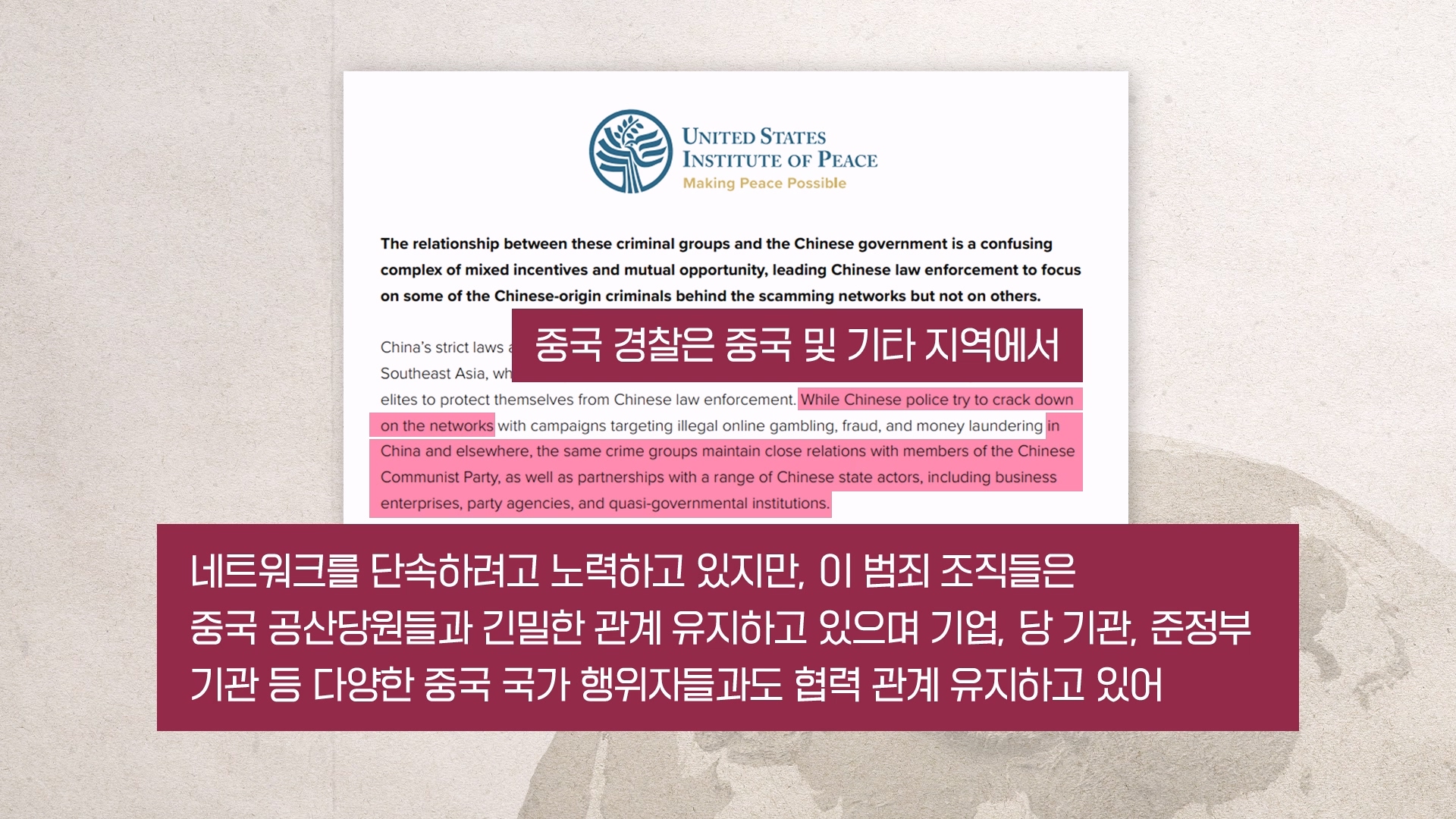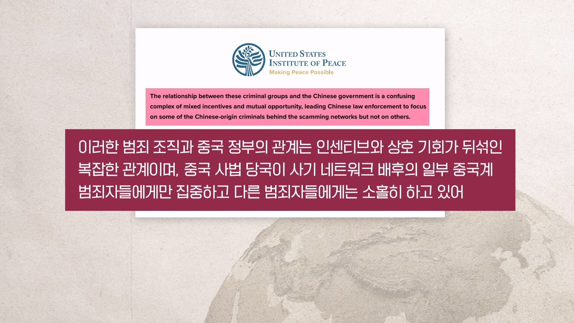 미국평화연구소의 연구원들도요. 이런 범죄 조직과 또 중국 정부의 관계는 인센티브와 상호 기회가 뒤섞인 복잡한 관계다, 그리고 중국 사법 당국이 사기 네트워크의 배후에 있는 일부 중국계 범죄자들에게만 집중을 하고 다른 범죄자들에게는 소홀히 하고 있다, 그리고 중국 경찰은 조직 범죄단을 단속을 하고 있지만 이 조직들은 중국 공산당원들과 긴밀한 관계를 유지를 하고 있고 기업, 당 기관, 그리고 준정부기관 등 다양한 국가 기관과도 협력 관계를 유지하고 있다, 이렇게 지적을 했습니다.