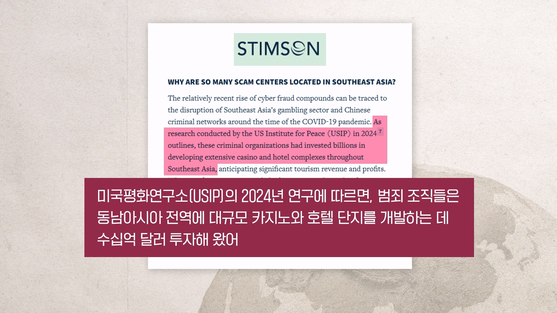 지난해 미국평화연구소의 연구에 따르면 이러한 범죄 조직들은 원래 동남아시아 전역에 대규모 카지노, 그리고 호텔 단지를 개발하는 데 수십억 달러를 투자를 해 왔습니다.