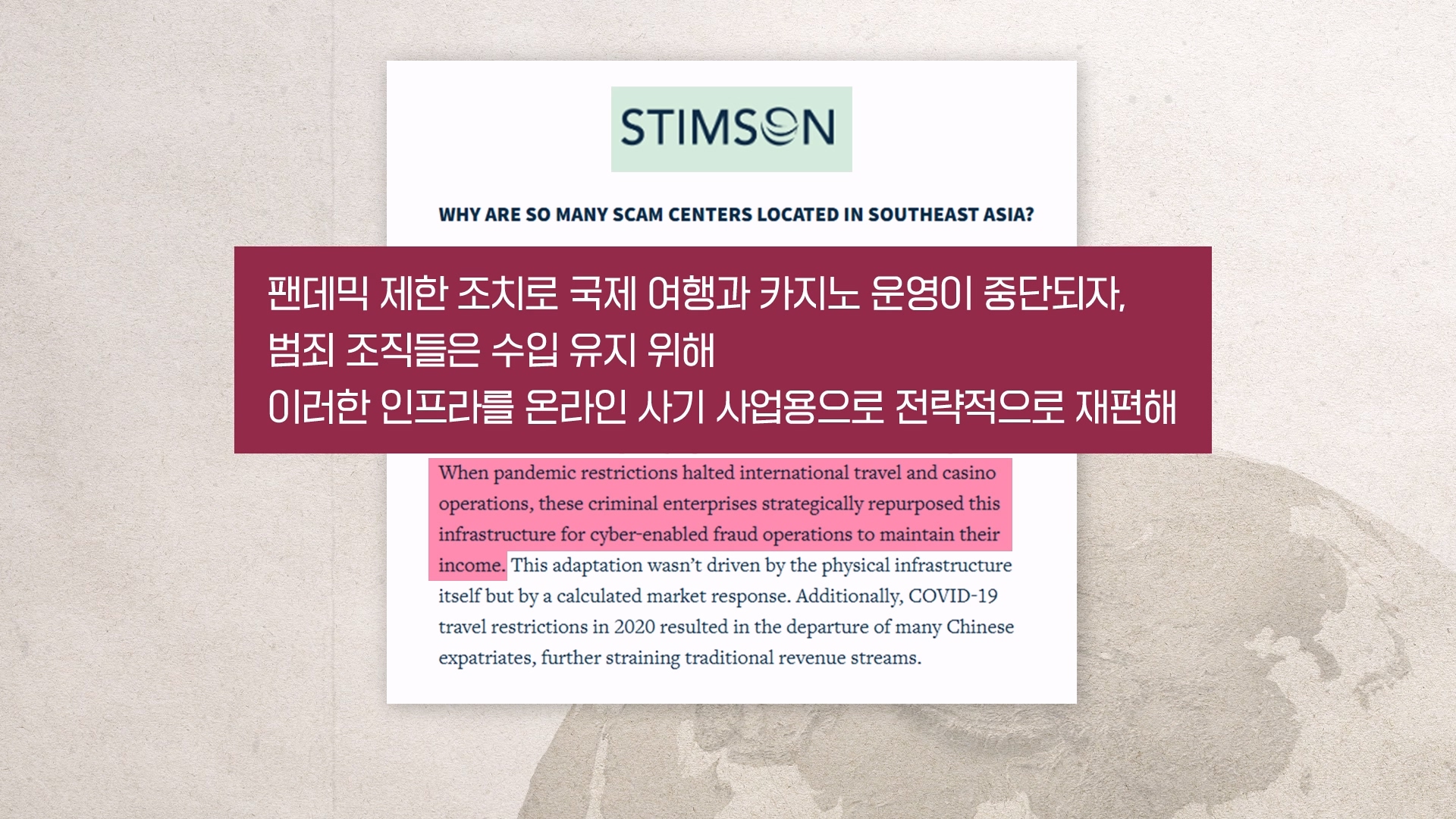 그런데 팬데믹으로 해외 여행과 카지노 영업이 중단이 되니까, 이들 조직이 이들 조직이 수입을 유지를 하기 위해서 기존 인프라를 온라인 사기 사업용으로 바꾸는 결정을 내렸다는 겁니다.
