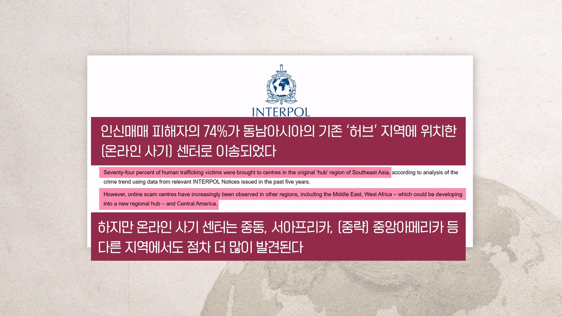 국제형사경찰기구(인터폴)의 지난 6월 발표에 따르면요. 인신매매 피해자의 74%가 동남아시아에 있는 사기 센터로 이송이 됐지만, 온라인 사기 센터는 중동, 서아프리카, 중앙아메리카 등 다른 지역에서도 점차 더 많이 발견이 되고 있습니다.