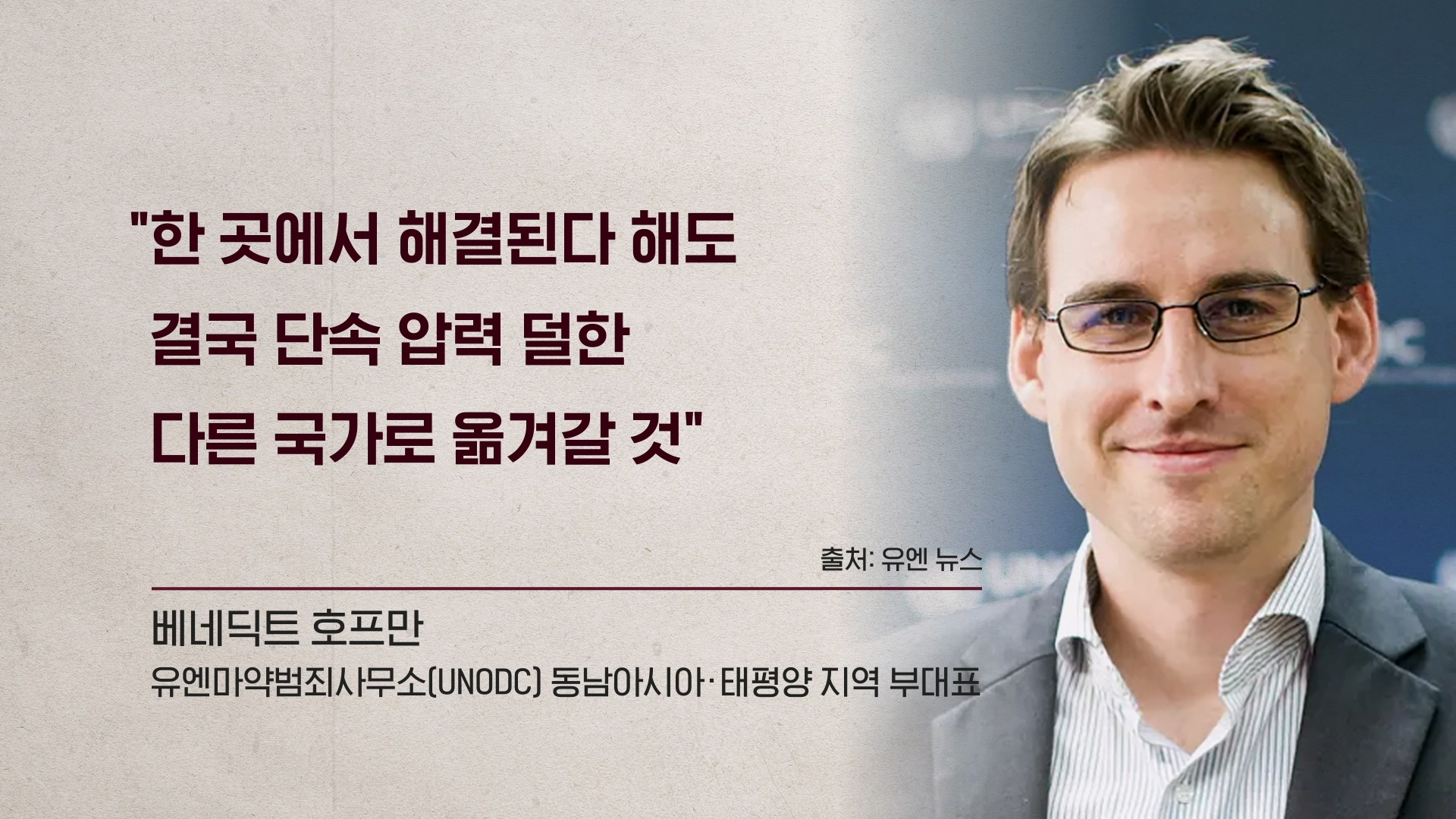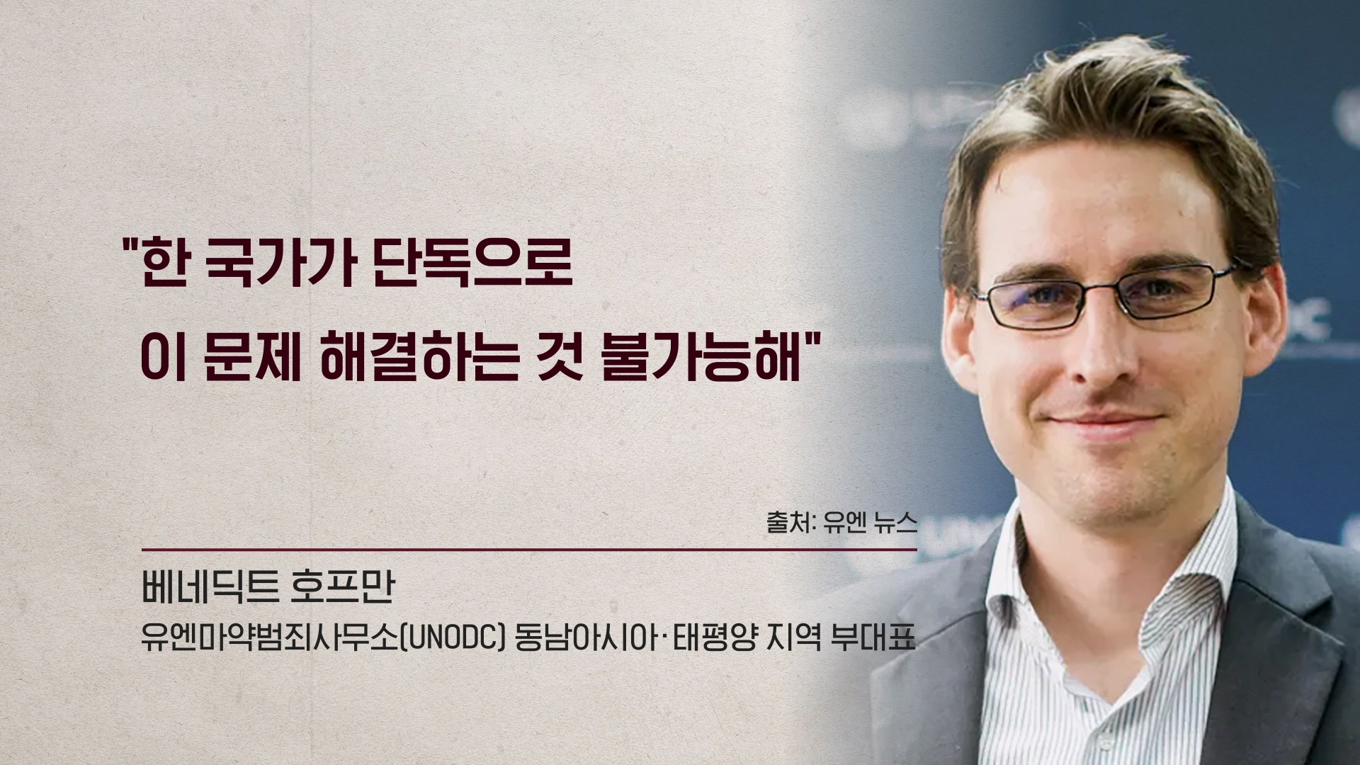 유엔 마약범죄사무소(UNODC) 동남아시아·태평양 지역 부대표의 유엔 뉴스와의 인터뷰를 보면요. 한 국가가 단독으로 이 문제를 해결하는 건 불가능하다라고 하면서요. 이러한 활동들이 한 곳에서 해결이 된다고 하더라도 결국 단속의 압력이 덜한 다른 국가로 옮겨갈 것이다라고 지적했습니다.