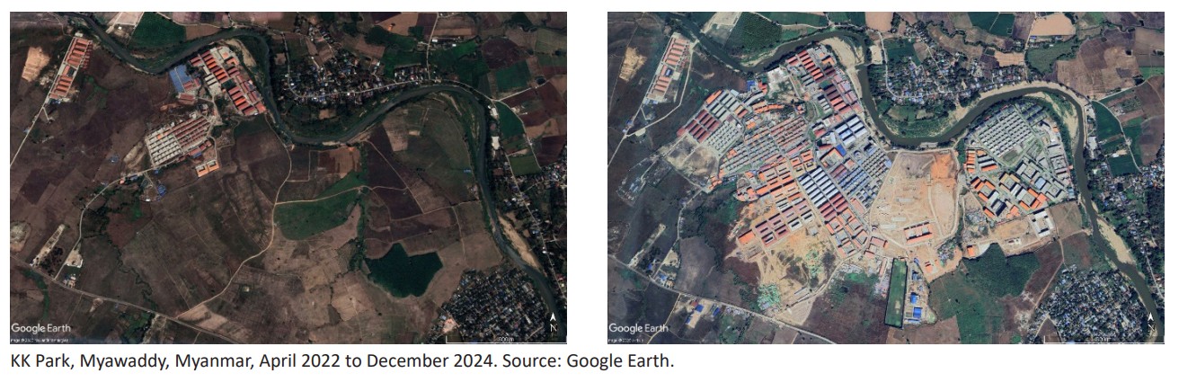 여기는 미얀마의 미야와디라는 도시의 모습인데요. 이곳은 그중에서도 온라인 사기 범죄의 진앙지로도 알려진 'KK파크'입니다. 2022년 4월과 또 2024년 12월 모습을 비교해 보면요. 단지가 넓게 확장이 되었음을 보실 수가 있는데요.