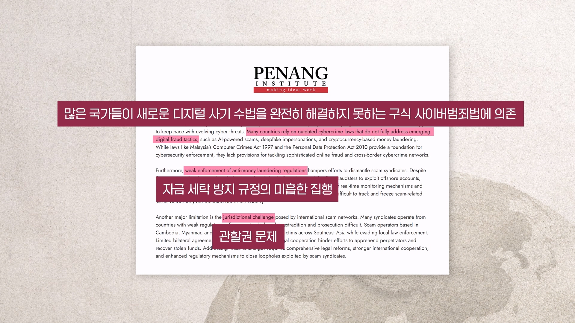 페낭 연구소의 한 박사는요. 많은 국가들이 새로운 디지털 사기 수법을 완전히 해결을 하지 못하는 구식 사이버범죄법에 의존하고 있다, 이렇게 현 상황을 지적을 했습니다. 그리고 자금 세탁 방지 규정이 있기는 하지만 이것이 집행이 잘 안 되고 있다, 이렇게 지적을 하면서 관할권 문제도 잘 해결을 해야 한다라는 취지로 주장을 했습니다.