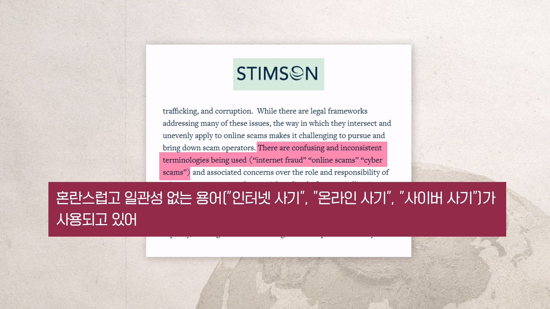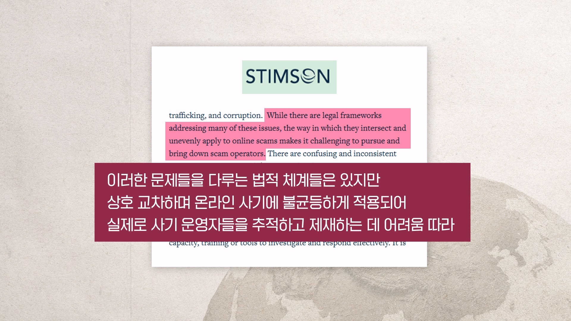 스팀슨 센터는 지난 8월 보고서에서요. 이런 문제를 지적을 했습니다. 개념 하나만 놓고 봐도 '인터넷 사기', '온라인 사기', '사이버 사기' 등 이렇게 혼란스럽고 일관성이 없는 용어들이 사용이 되고 있고, 더 나아가서 보자면 온라인 사기 문제를 다루는 법적 체계들은 존재를 하긴 하지만 법적 잣대를 댈 때 이게 불균등하다, 이런 문제가 있기 때문에 실제로 사기 범죄자들을 추적하고 제재를 하는 데에 어려움이 따른다라고 지적을 했습니다.