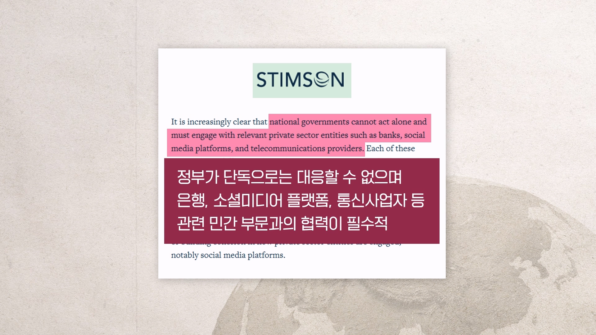 그러면서 이 보고서는요. 이 문제 해결법에 대해서 은행, 소셜미디어 플랫폼, 그리고 통신 사업자 등 관련 민간 부문과의 협력이 필수적이다라고 말을 했습니다.