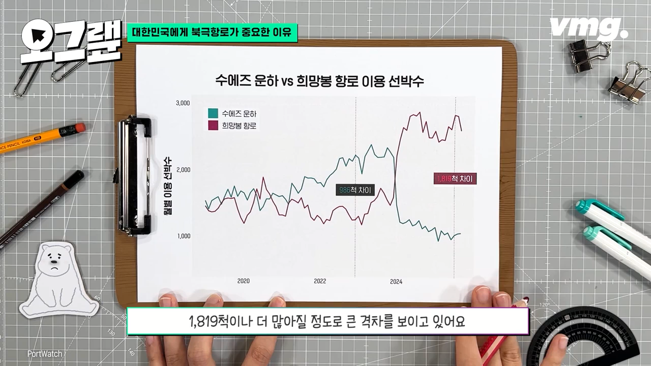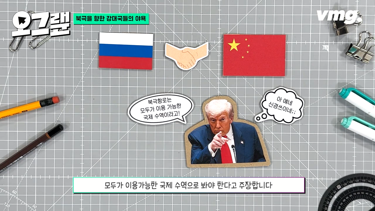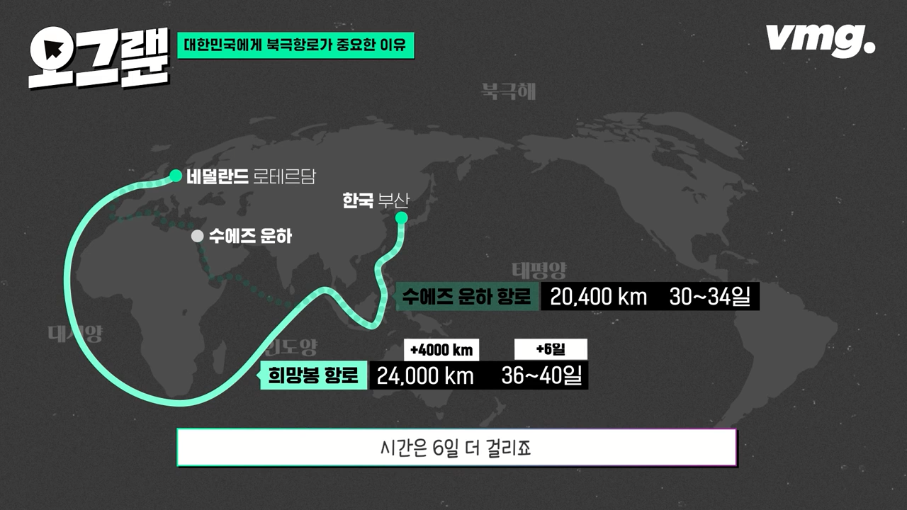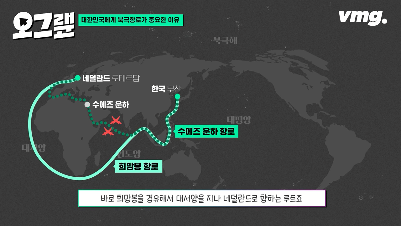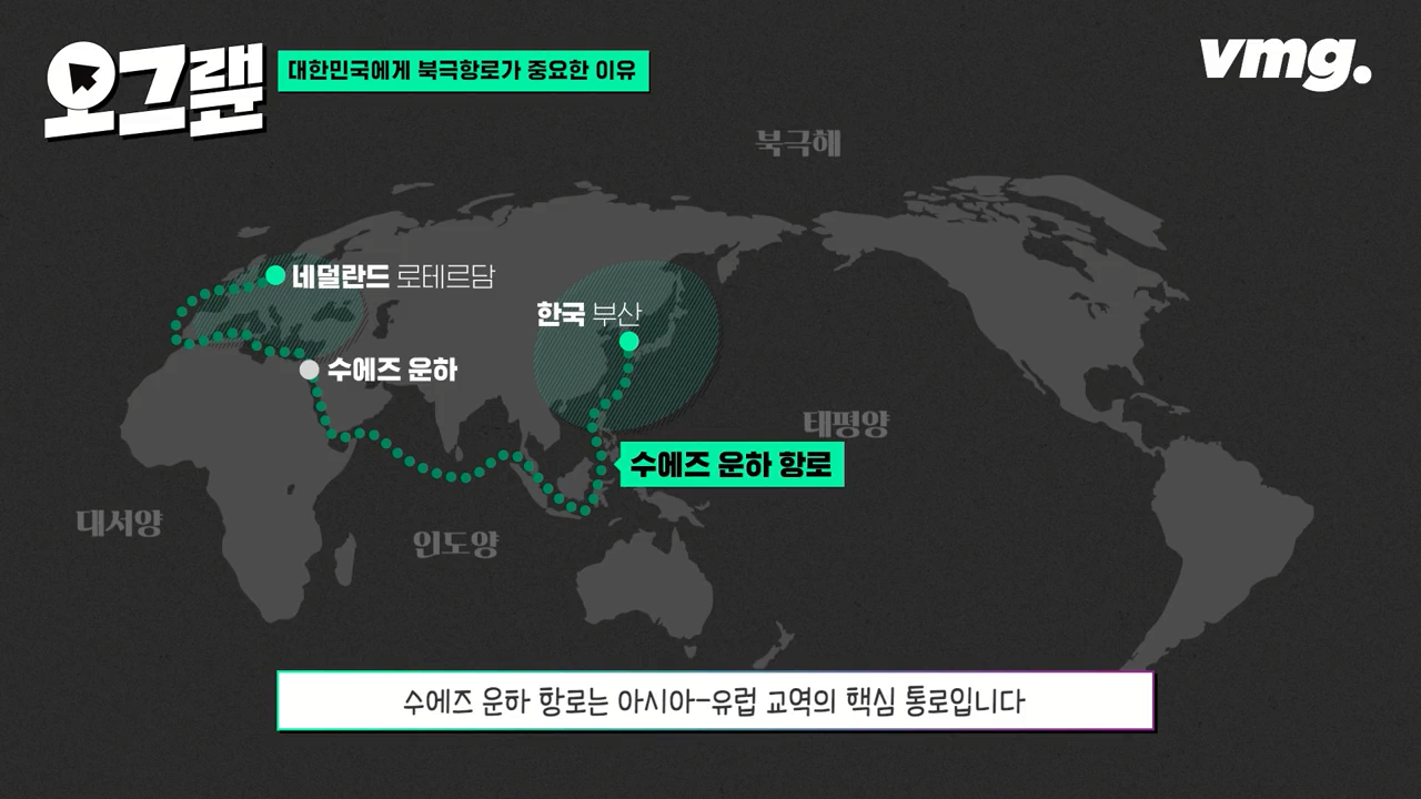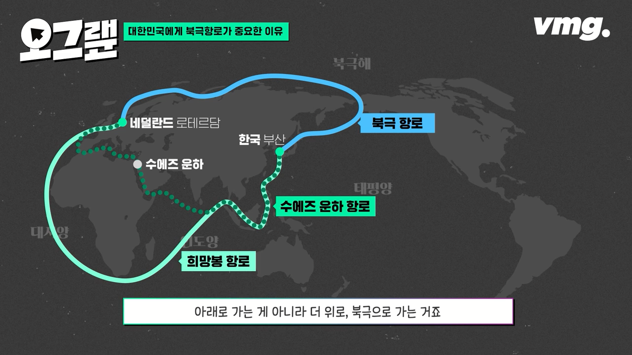 그 돌파구가 될 수 있는 게 바로 북극항로일 수 있는 거죠. 아래로 가는 게 아니라 더 위로, 북극으로 가는 거죠.
