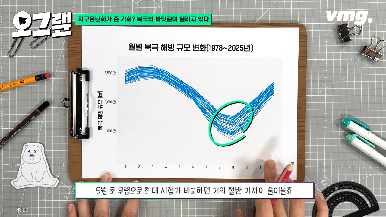 최근으로 오면 올수록 해빙 면적이 점점 줄어들고 있죠. 1970년대 말에는 미국 본토 크기만 한 해빙이 있었다면, 지금은 그 절반 수준으로 줄어들었어요. 이렇게 된 건 우리 모두가 다 알고 있는 지구온난화의 영향 때문입니다.