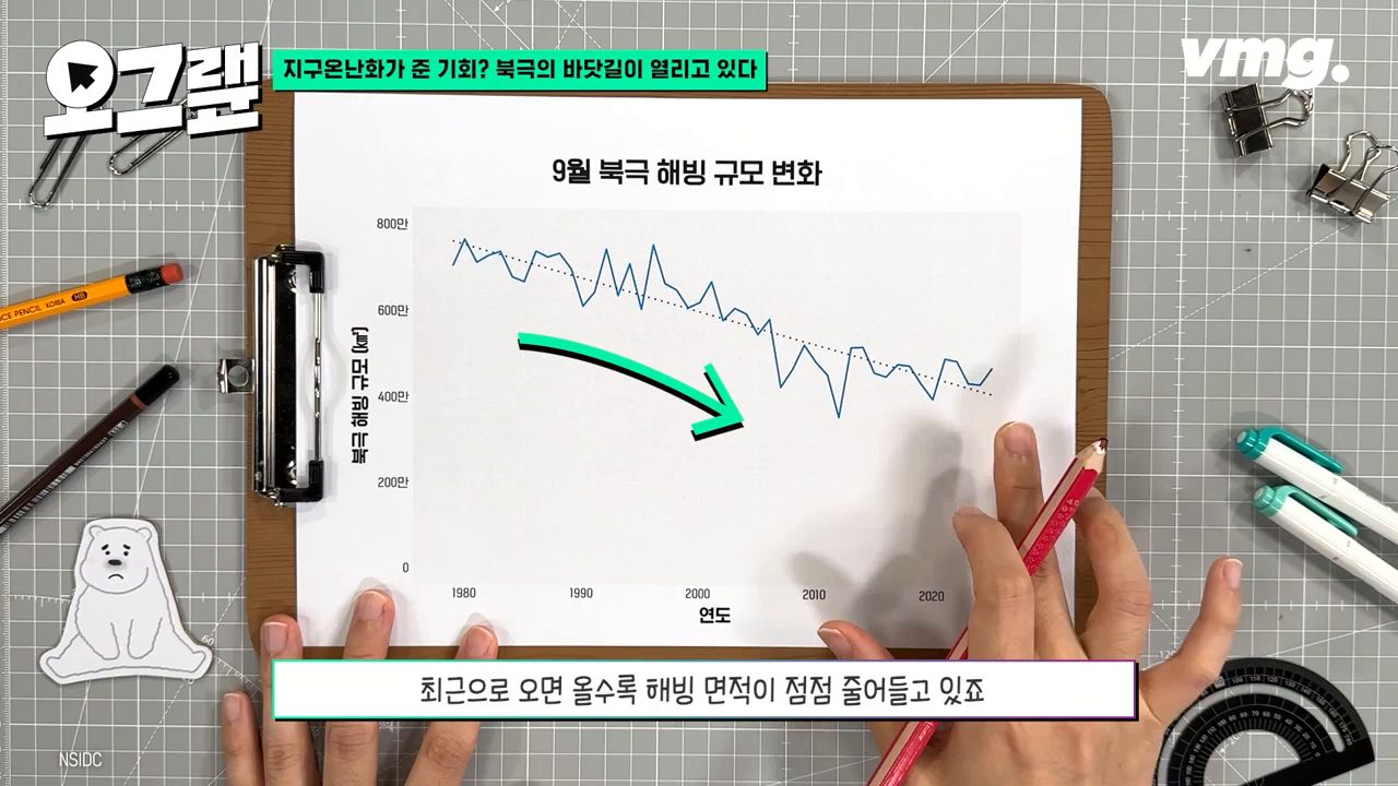 추운 극지방 북극이 지구상에서 가장 핫한 곳이 되고 있습니다. 북극권에 속해있는 미국, 러시아 같은 나라뿐 아니라, 중국, 그리고 우리나라도 북극에 대한 관심을 내비치고 있죠. 이번 정부에서는 북극항로 개척을 대선 공약으로 약속한 만큼 관련해서 내년 예산에 총 5,499억 원을 편성하기도 했어요. 오늘 오그랲에서는 도대체 북극이 왜 이렇게 핫해진 건지, 또 북극항로라는 게 정말 가능성이 있는지 데이터를 통해 살펴보도록 하겠습니다.