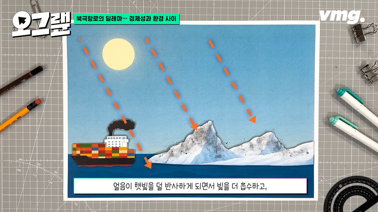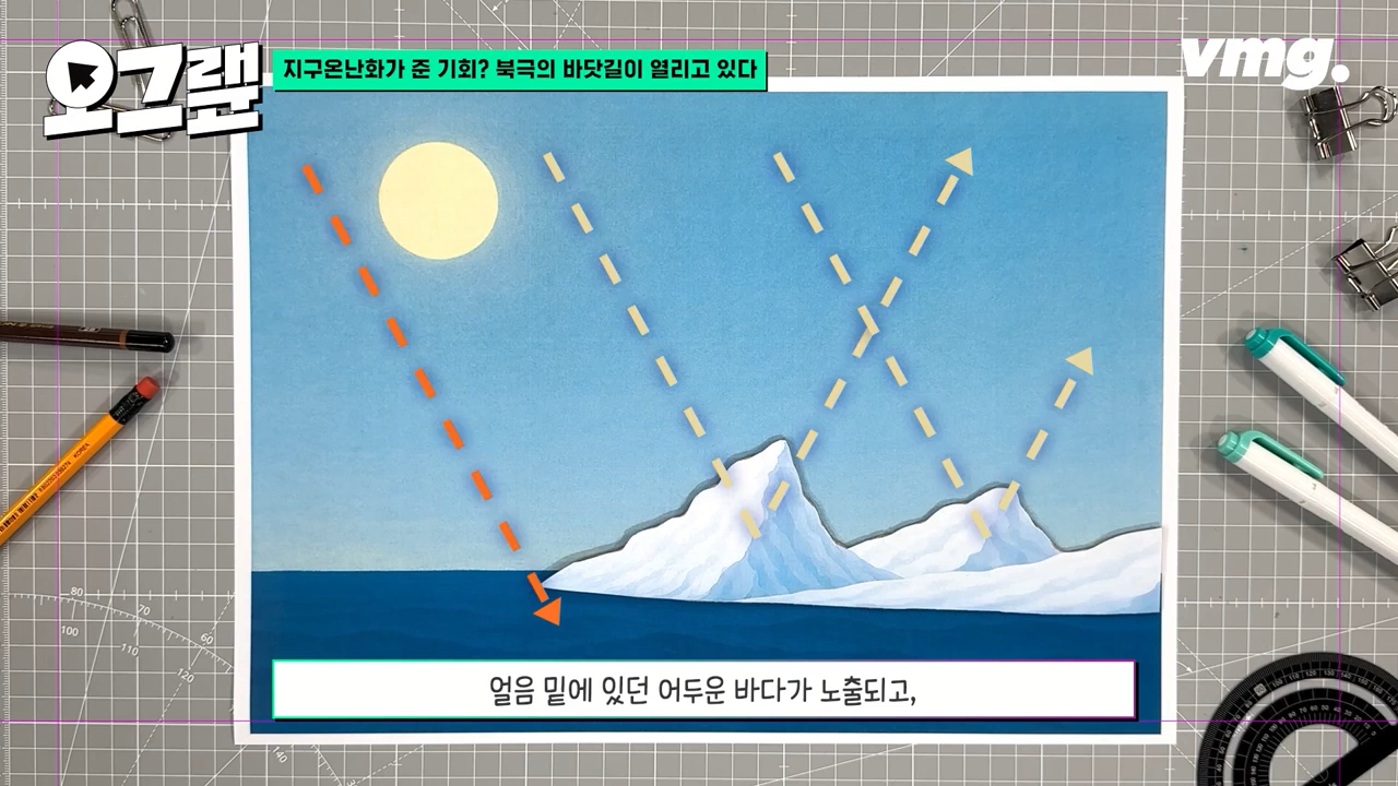 북극에 있는 해빙은 태양빛을 우주로 반사하는 거대한 거울 역할을 합니다. 그런데 이 친구들이 녹아버린다면요? 얼음 밑에 있던 어두운 바다가 노출되고, 그러면 태양빛을 반사하는 양은 줄어들고 흡수하는 양이 늘어나게 됩니다. 게다가 북극의 영구동토층이 녹으면서 온실효과가 강한 메탄 같은 기체가 배출되면서 상승세가 가속되고 있어요. 기후 위기가 심각해지면서 북극을 뒤덮고 있던 해빙이 더 많이 녹고 그 영향으로 북극의 바닷길이 열리고 있습니다.