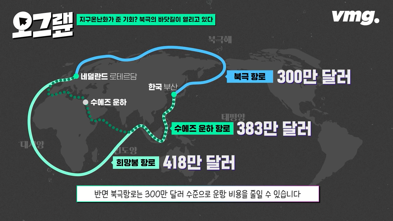 유럽 시장과의 거리를 단축시킬 수 있는 새로운 대안 항로로 북극항로가 떠오르게 된 거죠. 만약 여름철 해빙이 많이 녹았을 때에 북극항로를 이용한다면 그 운송비용은 기존 항로 대비 크게 줄어듭니다.