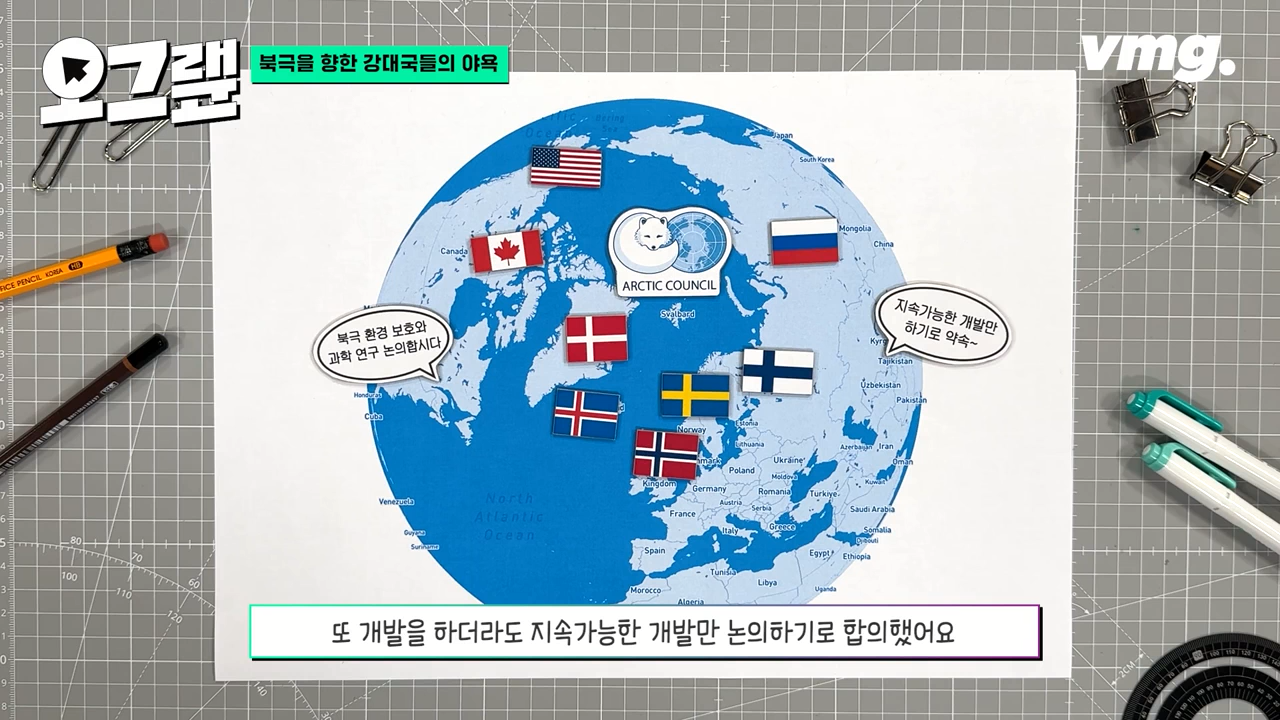 미국, 캐나다, 덴마크, 아이슬란드, 노르웨이, 스웨덴, 핀란드, 그리고 러시아까지 8개 국가들은 1996년에 북극에 관련된 각종 문제를 논의하는 북극이사회를 꾸렸습니다. 북극이사회에선 북극의 환경 보호와 과학적 연구, 또 개발을 하더라도 지속가능한 개발만 논의하기로 합의했어요. 과거 냉전 시기의 북극은 미국과 소련의 잠재적 공격 루트이자, 군사 작전 지역이었지만 냉전이 끝나고 꾸려진 북극이사회에선 북극을 인류를 위해서, 평화롭게 이용하자고 약속한 거죠.
