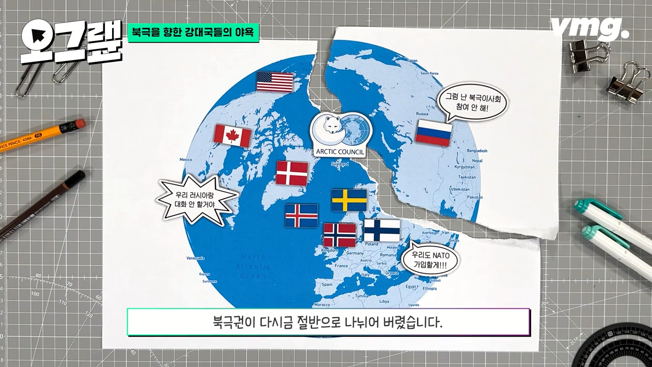 하지만 러시아의 우크라이나 침공으로 북극이사회에 균열이 발생했습니다. 러시아를 제외한 7개 회원국이 러시아를 보이콧했고, 러시아는 이사회 참여 중단을 선언했거든요. 게다가 러시아의 침공 이후 안보가 불안해진 핀란드와 스웨덴이 연이어 NATO에 가입하면서 북극권이 다시금 절반으로 나뉘어 버렸습니다.