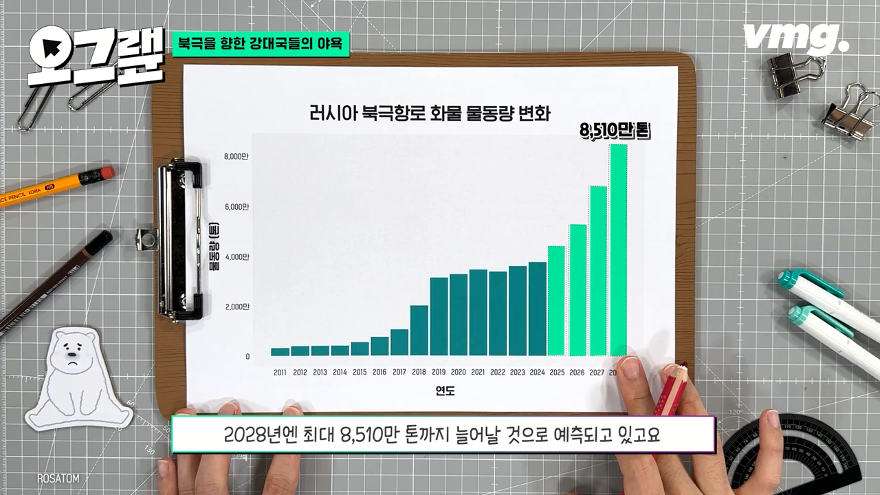 2011년 311만 톤이었던 러시아 북극항로 물동량은 작년 3,789만 톤으로 역대 최고치를 찍었습니다. 앞으로 그 규모는 꾸준히 증가해 2028년엔 최대 8,510만 톤까지 늘어날 것으로 예측되고 있고요. 이렇게 점점 북극항로가 열리고 있지만, 서방의 제재가 풀리지 않는다면 당장 국제 운송로로 활용되기는 어려울 겁니다.
