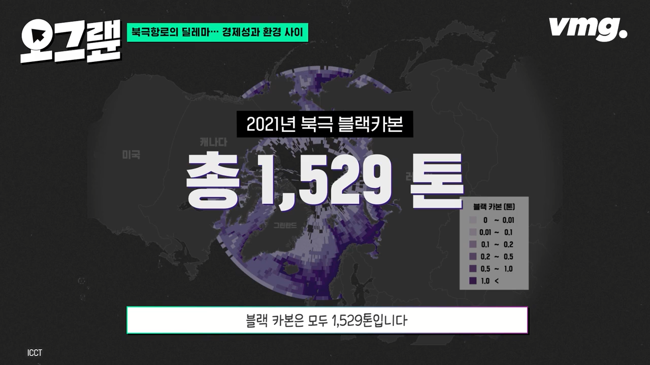 이 지도는 2021년 북극 지역에 배출된 블랙 카본을 시각화한 자료입니다. 2021년 북극에서 운항한 선박들이 배출한 블랙 카본은 모두 1,529톤입니다.