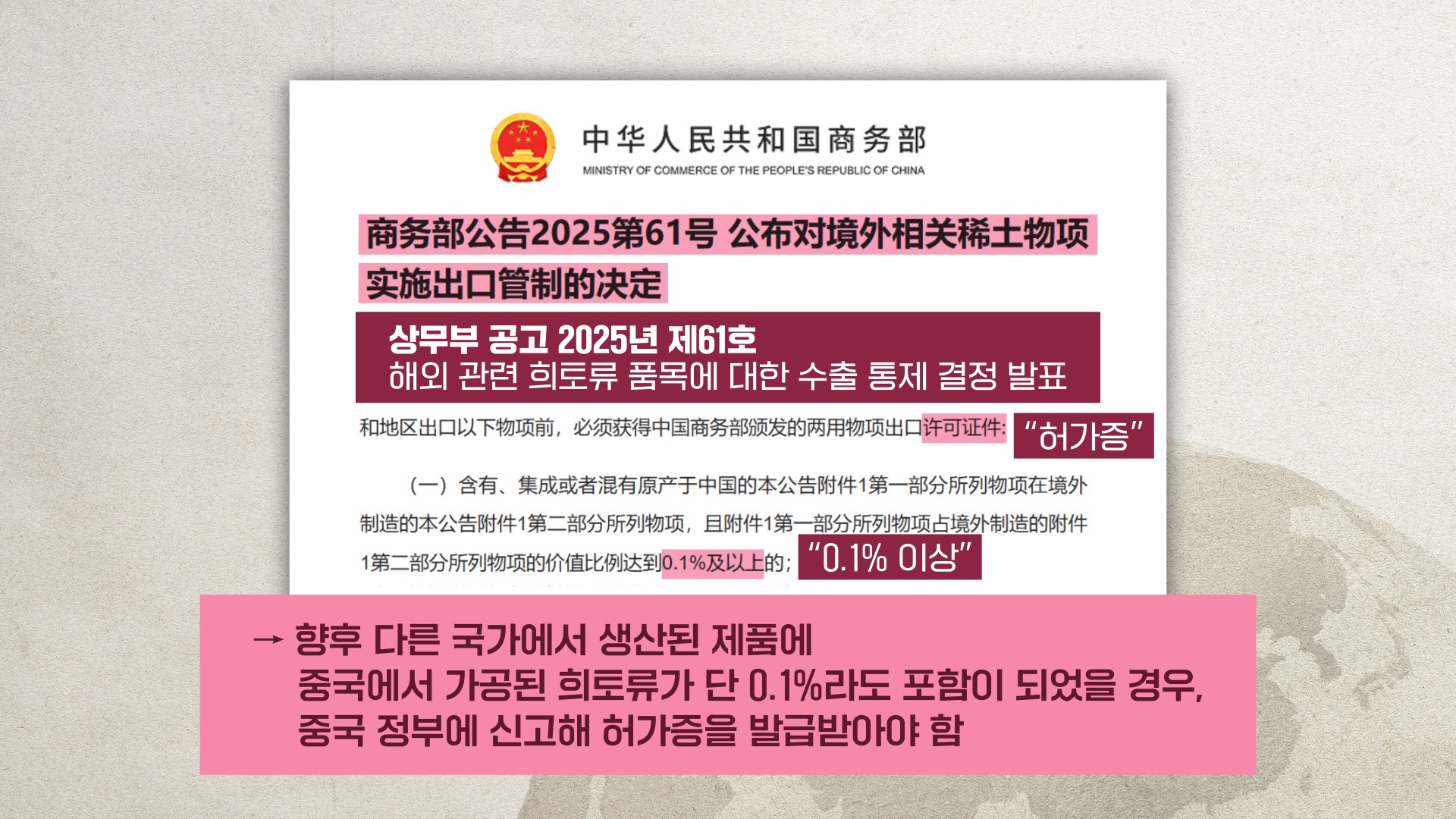 지금 보시는 게 제61호 공고인데요. 이 공고에는 향후 다른 국가에서 생산된 제품에 중국에서 가공된 희토류가 단 0.1%라도 포함이 되었을 경우 중국 정부에 신고를 해서 허가증을 발급받아야 한다는 내용이 담겼는데요. 이는 과거 미국의 반도체 규제와도 유사합니다.
