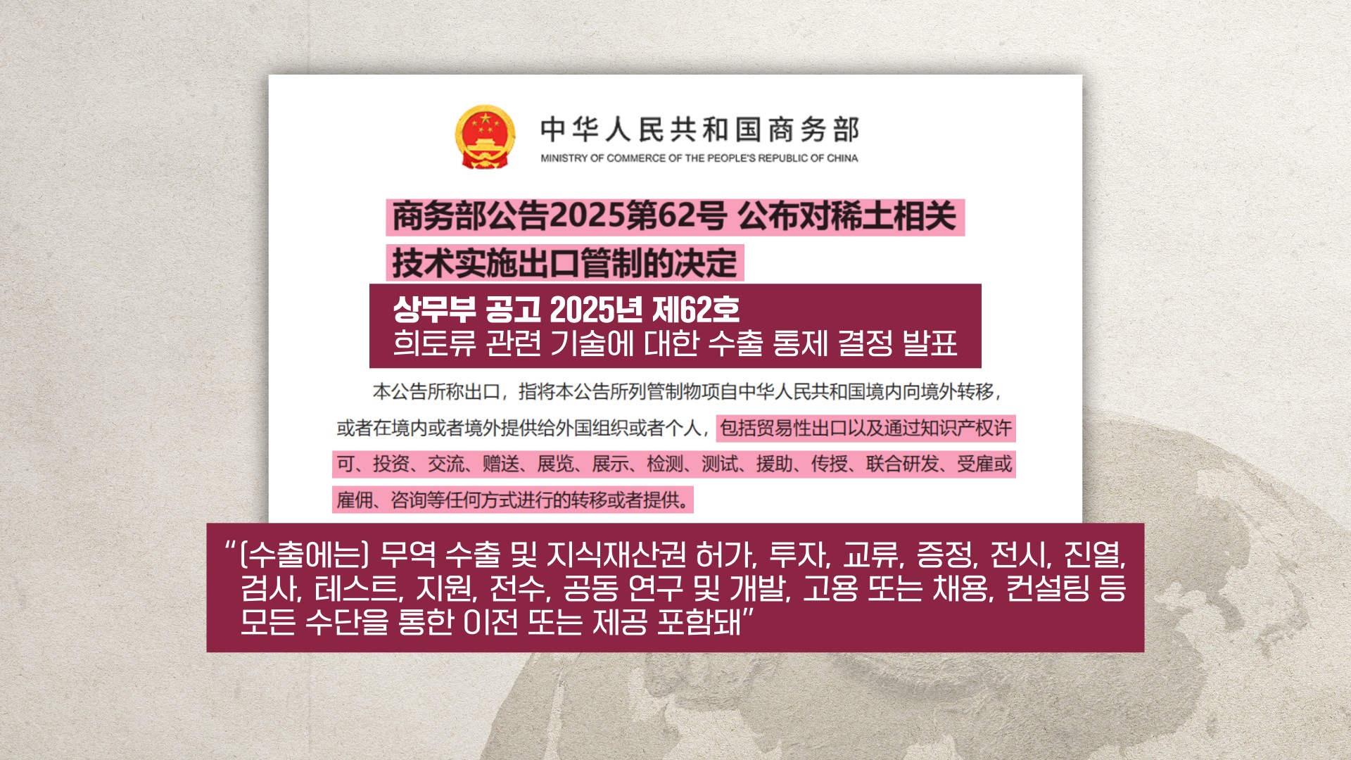또 지금 보시는 건 제62호 공고인데요. 여기에는 희토류 채굴, 그리고 제련 등과 관련된 기술, 그리고 지식재산권 허가, 전시, 테스트, 지원, 고용 등을 포함한 어느 형태의 기술 이전 또는 제공도 전부 통제한다는 내용이 담겼습니다.