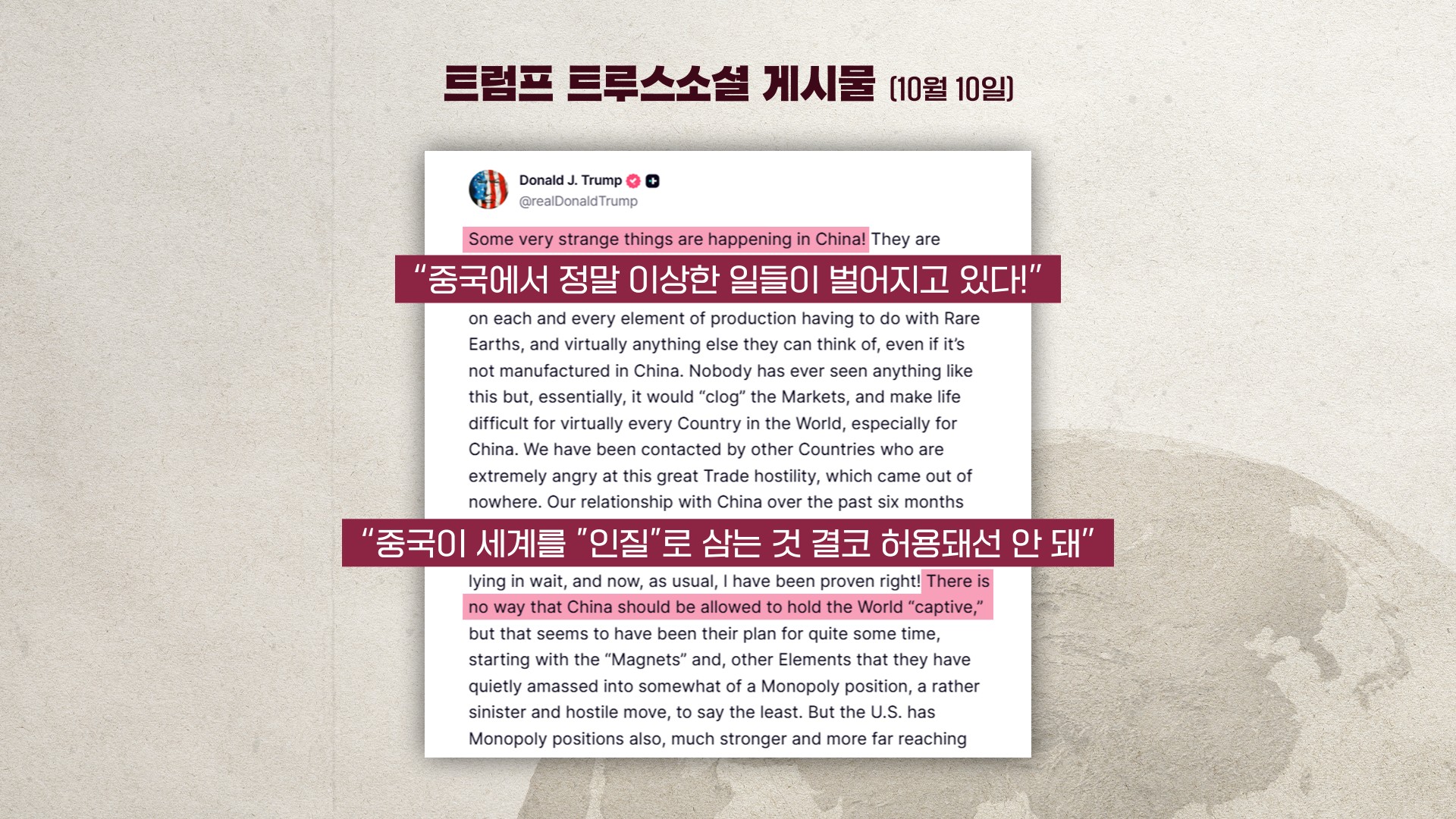 트럼프 대통령은 지난 10월 10일 트루스 소셜에서 "중국에서 정말 이상한 일들이 벌어지고 있다"고 하면서 "중국이 세계를 '인질'로 삼는 것은 결코 허용이 돼서는 안 된다"라고 적었습니다.