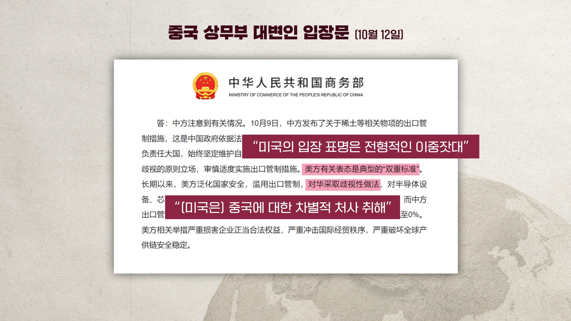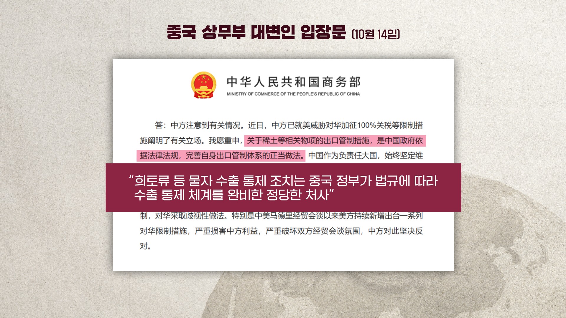 반면 중국 상무부 대변인은 홈페이지에 게시한 입장문을 통해 이런 입장을 냈습니다. "희토류 등 물자 수출 통제 조치는 중국 정부가 법규에 따라서 수출 통제 체계를 완비한 정당한 처사다"라고 했습니다.