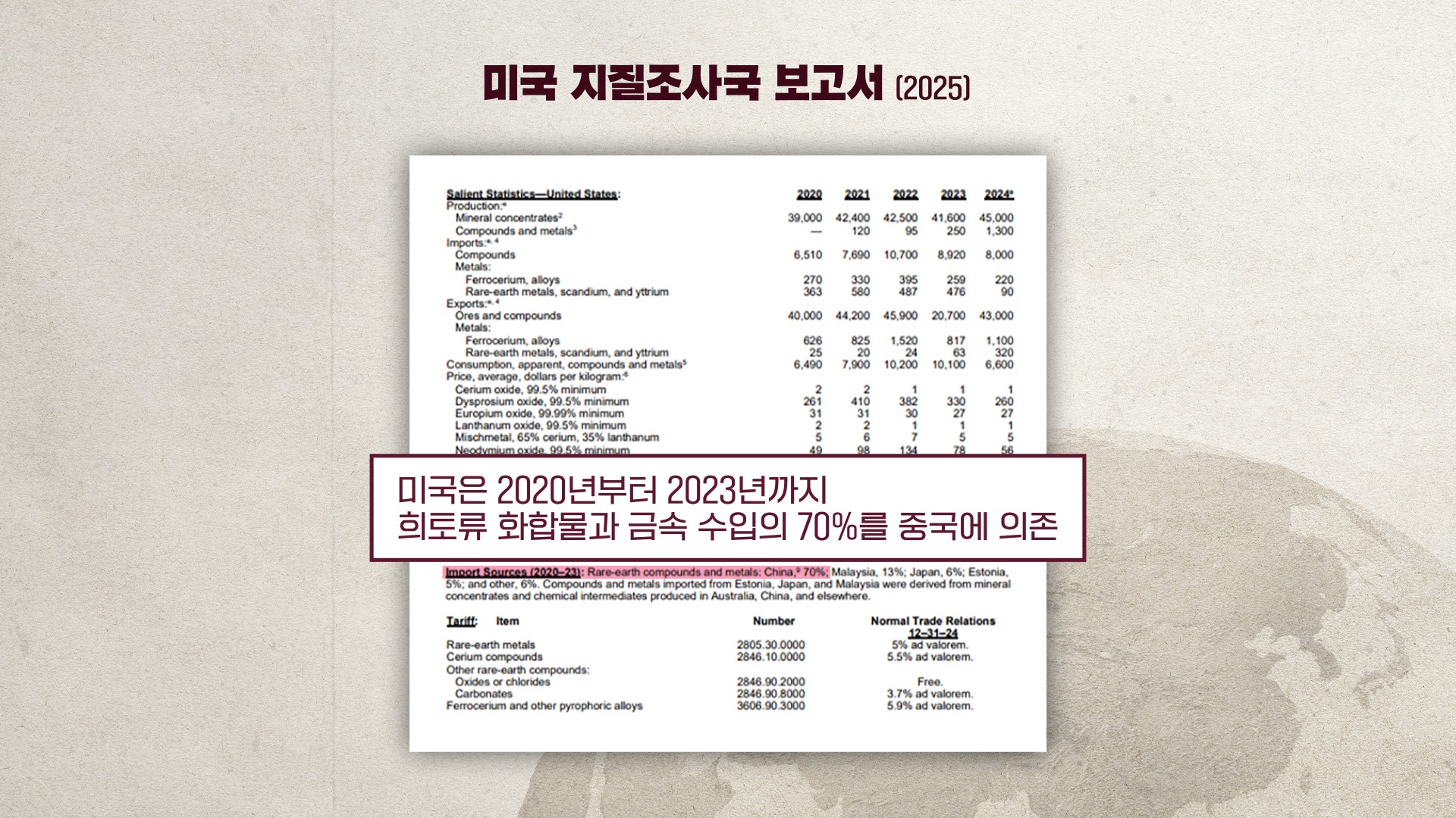 미국 지질조사국 보고서에 따르면 미국은 2020년부터 2023년까지 모든 희토류 화합물과 금속 수입의 70%를 중국에 의존했습니다.