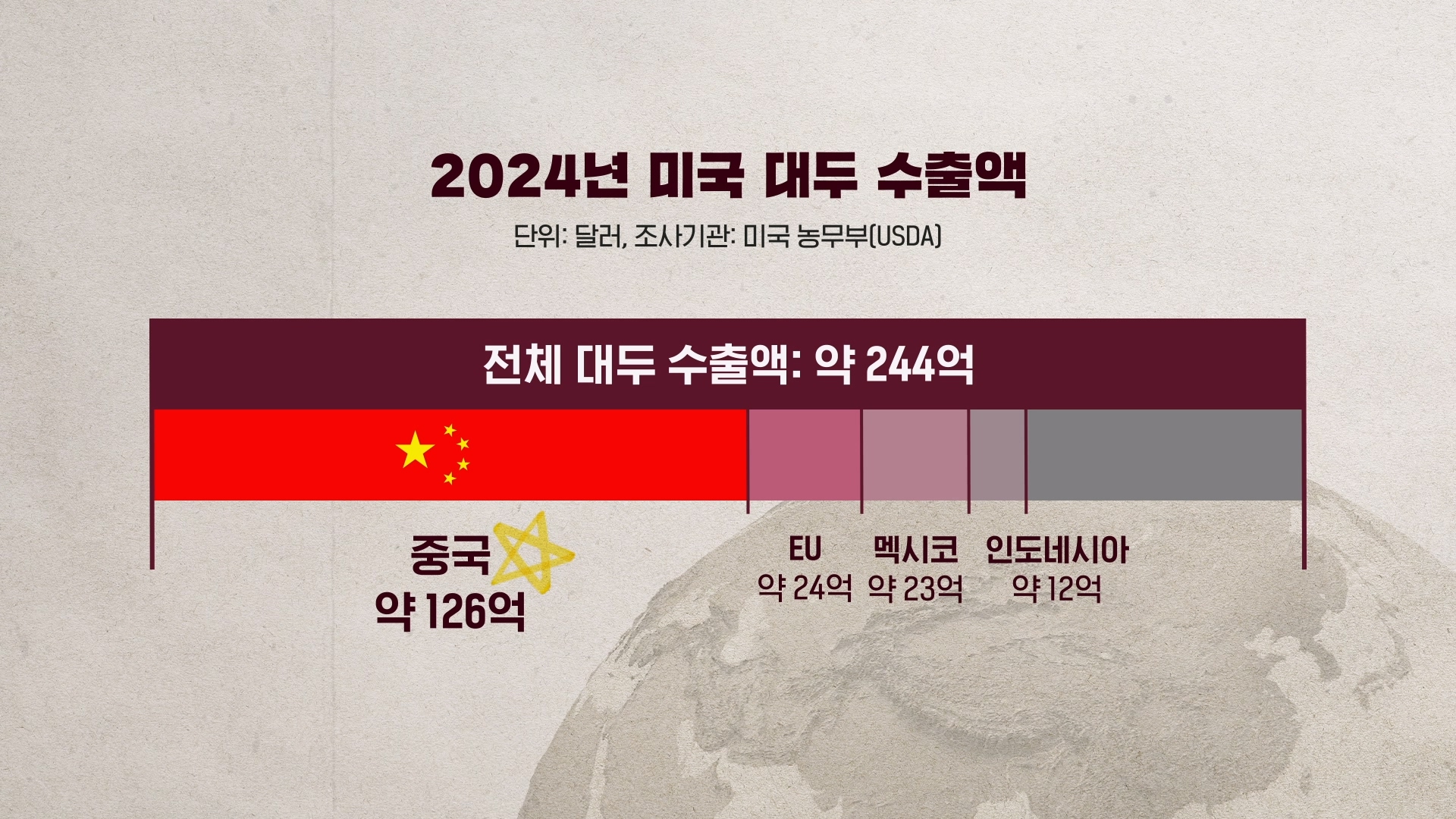 미국 농무부(USDA) 자료에 따르면 중국은 지난해 미국 대두 수출의 절반 가량인 약 126억 달러(약 18조 원)을 차지했을 정도로 미국 대두의 주요 수입국입니다.
