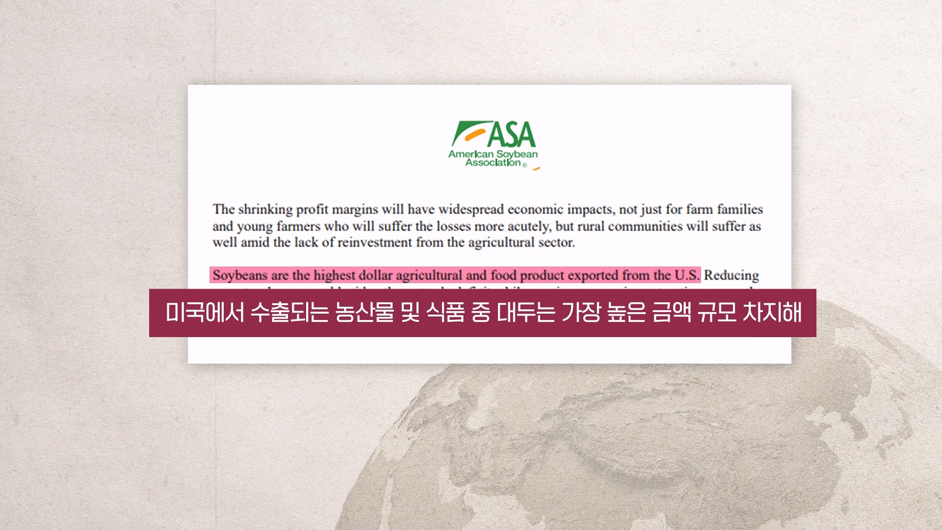 미국대두협회 보고서에서는 "미국에서 수출이 되는 농산물 및 식품 가운데 대두는 가장 높은 금액 규모를 차지하는 품목"이라면서 무역 협정에서의 '합리적 결과'가 절실하다고 말했습니다.