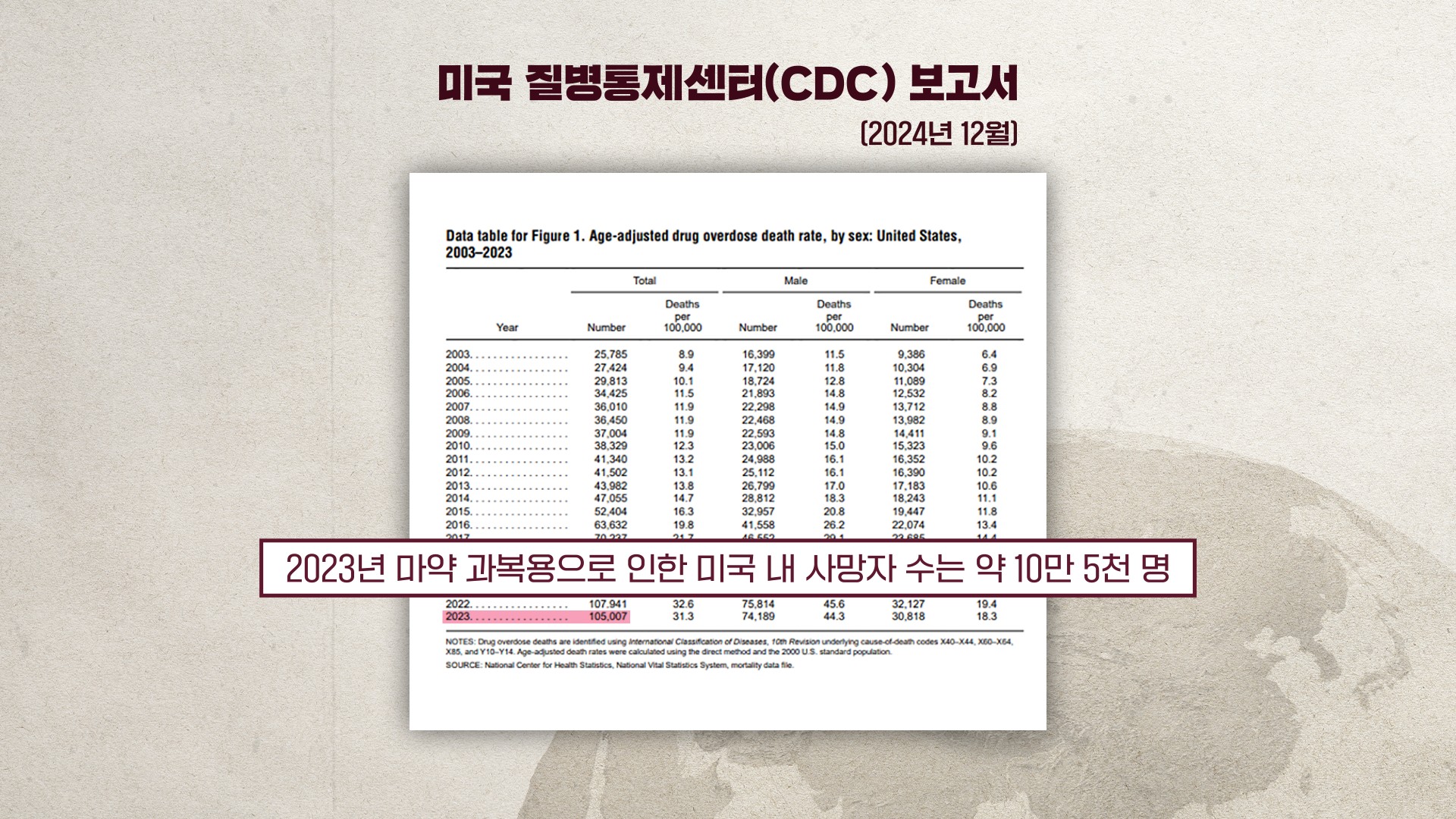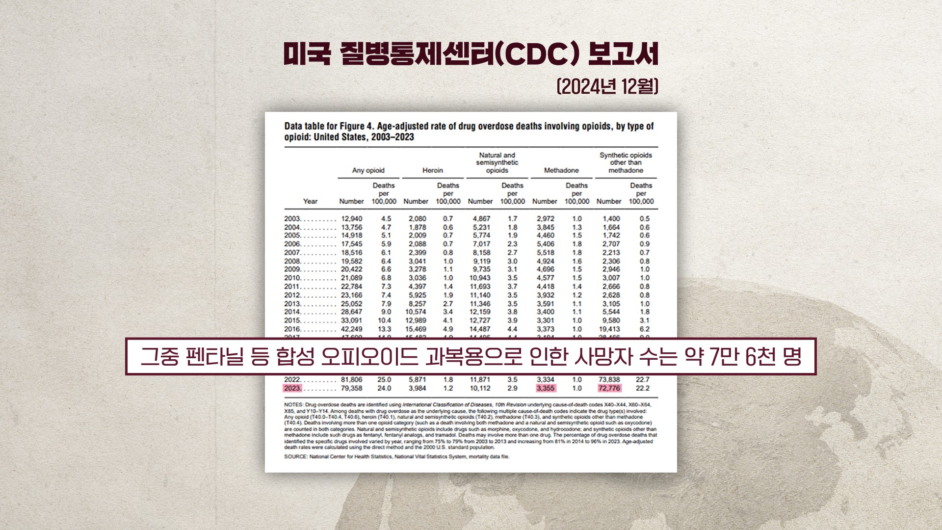 미국 펜타닐 사망자 수를 보시면 2023년에는 약 10만 5천 명이 미국에서 마약 과복용으로 사망을 했고요. 그중 펜타닐 등 합성 오피오이드(아편성 진통제)로 사망한 사람만 7만 6천 명 이상이었습니다.