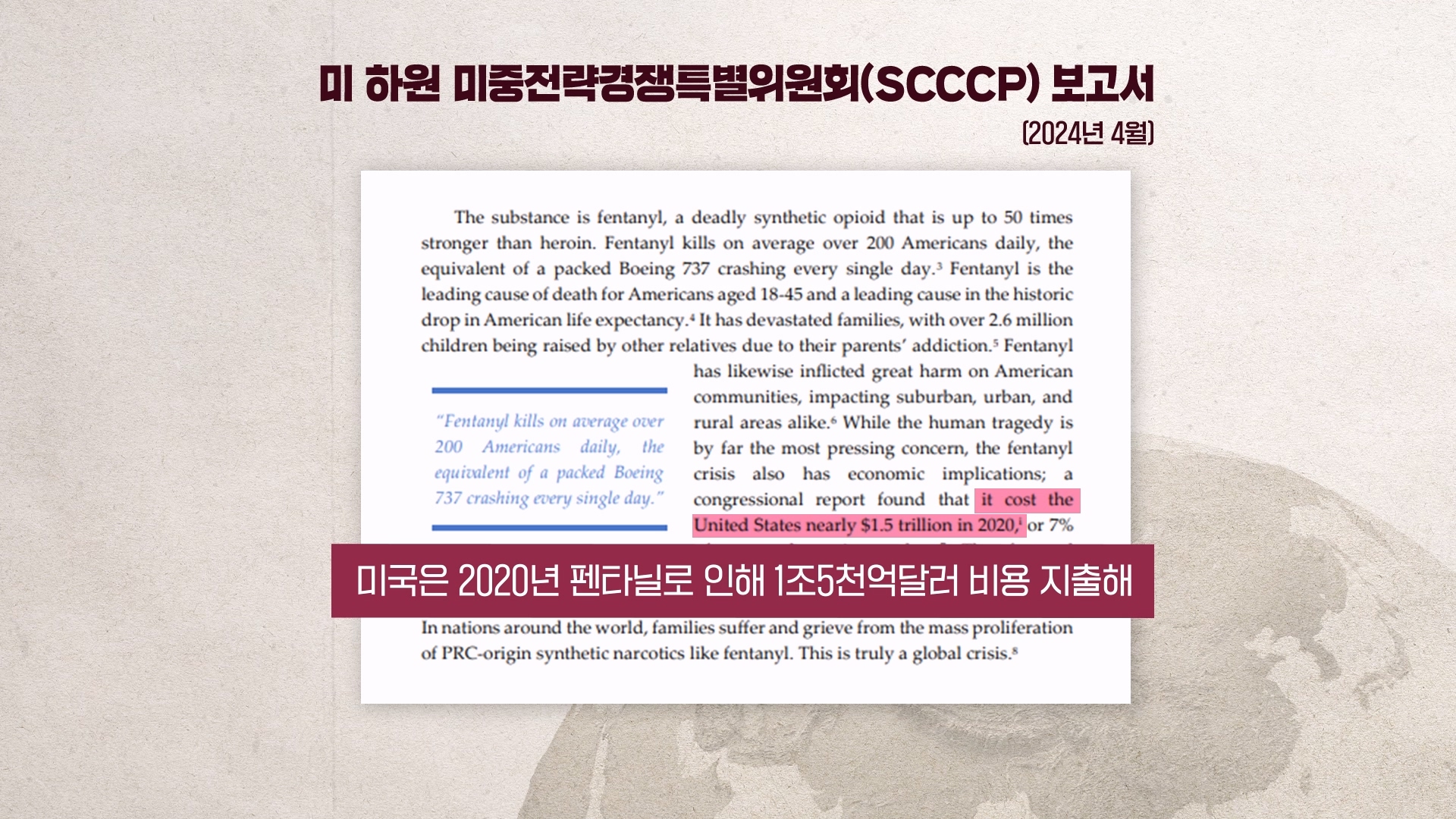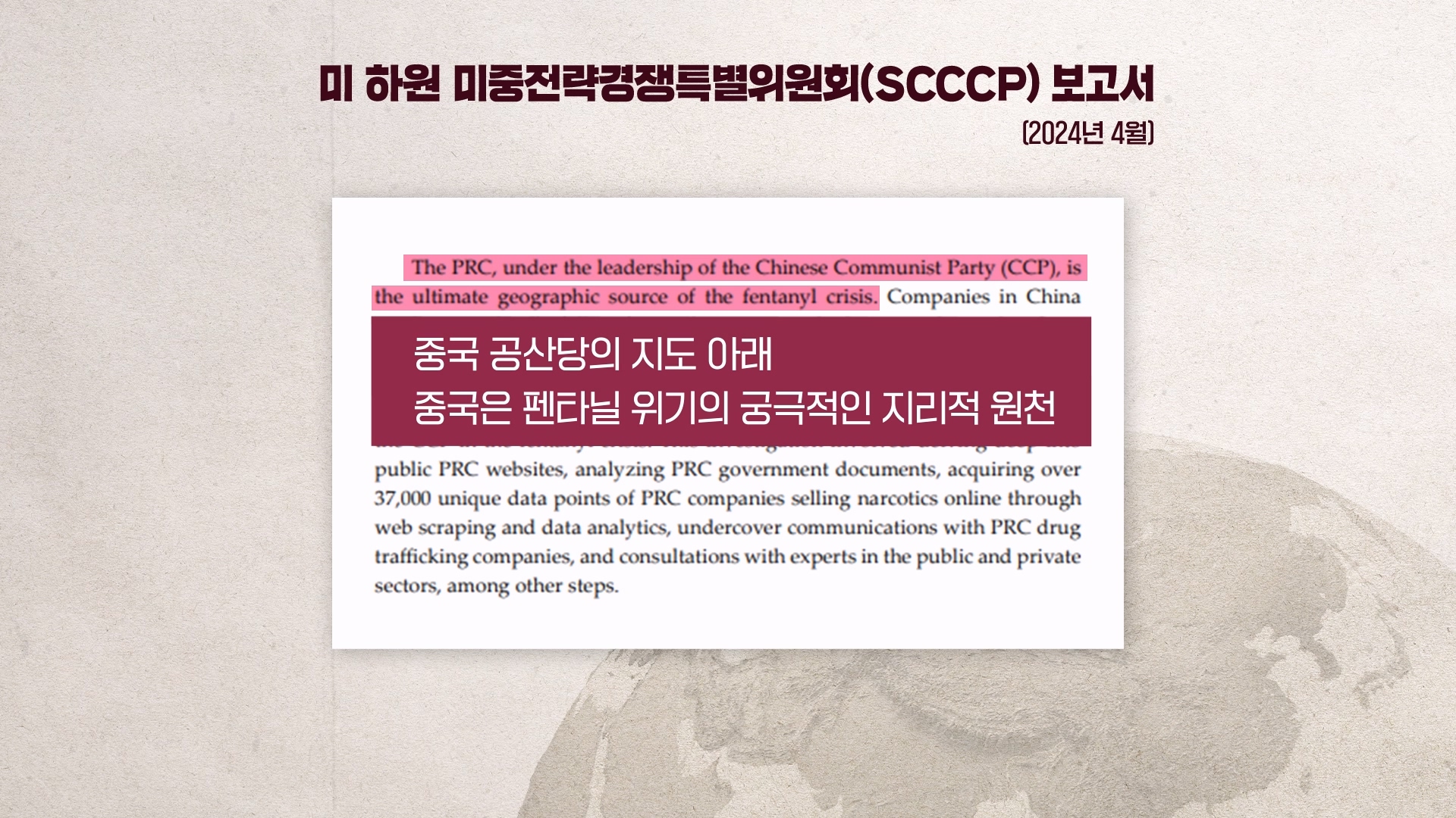 또 같은 보고서에서 "중국 공산당의 지도 아래 중국은 펜타닐 위기의 궁극적인 지리적인 원천이다"라고 지적했습니다.