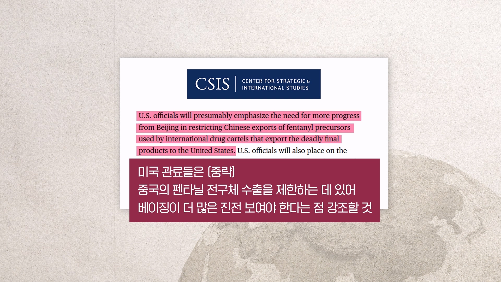 미국 전략국제문제연구소인 CSIS의 학자들은요. "미국 관료들은 중국의 펜타닐 전구체(원료) 수출을 제한하는 데 있어서 베이징이 더 많은 진전을 보여야 한다는 점을 강조할 것"으로 예상된다라고 분석했습니다.
