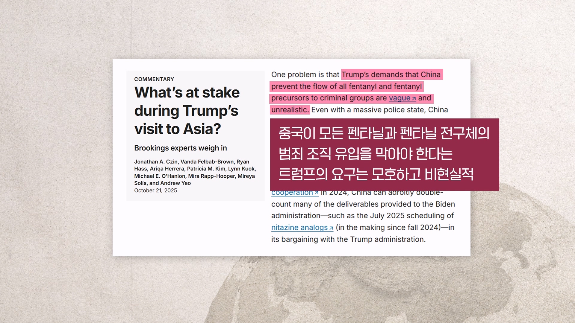 미국 싱크탱크 브루킹스 연구소에서는 "중국이 모든 펜타닐과 펜타닐 전구체가 범죄 조직으로 유입되는 것을 막아야 한다는 트럼프 대통령의 요구가 모호하고 비현실적"이라는 것을 문제라고 지적했습니다.