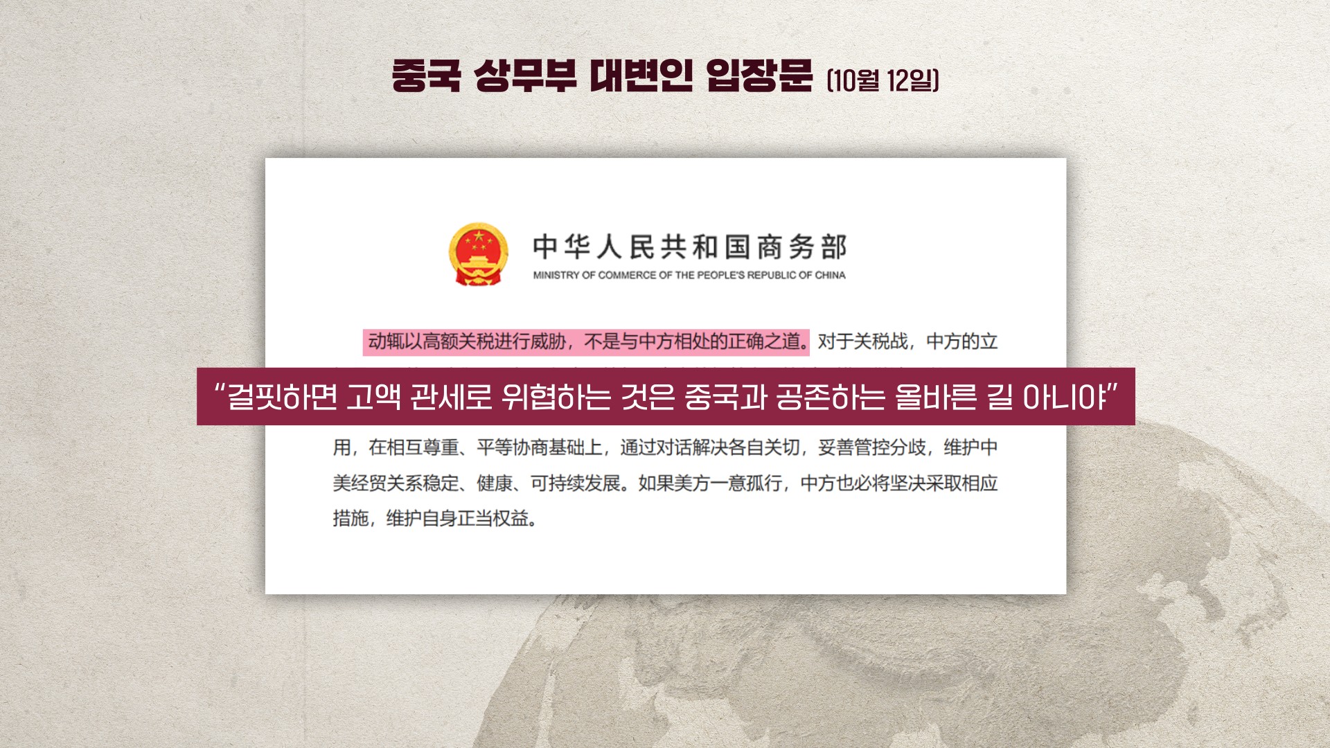 현재 부과가 되고 있는 대중국 관세에 추가 관세 100%를 더해서 도합 약 157%의 관세를 부과하겠다는 미국 측에, 중국 상무부 대변인은 10월 12일에 이런 반응을 내놓았습니다. 걸핏하면 미국이 고액 관세로 위협하는 건 중국과 공존하는 올바른 길이 아니다, 이런 입장문을 발표했습니다.