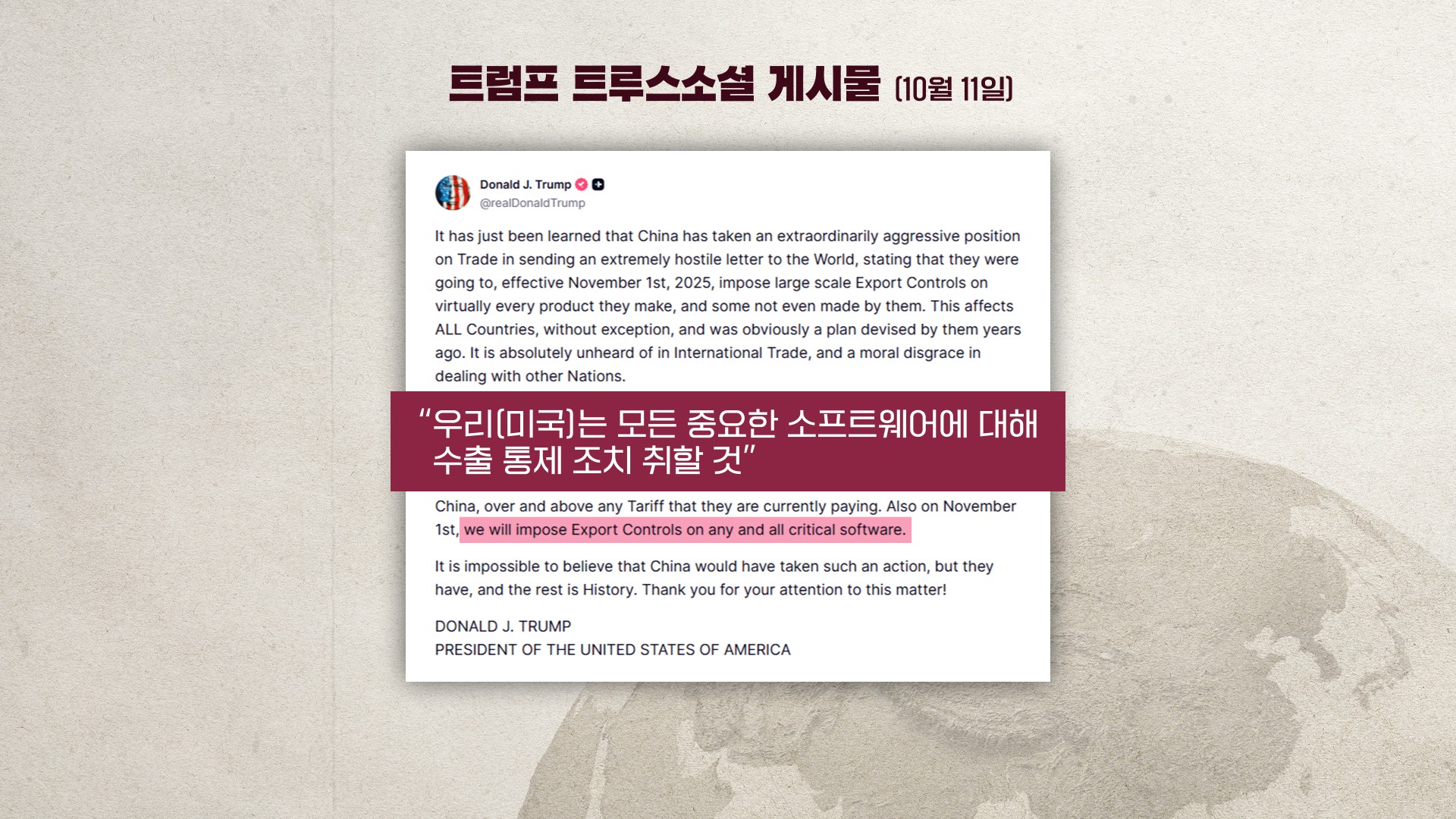 구체적으로 중국의 희토류 수출 통제 발표 직후 트럼프 대통령은 트루스 소셜에 이렇게 썼습니다. 100% 추가 관세에 더해서 "미국은 모든 중요한 소프트웨어에 대해서 수출 통제 조치를 취할 것입니다" 이렇게 적었습니다.