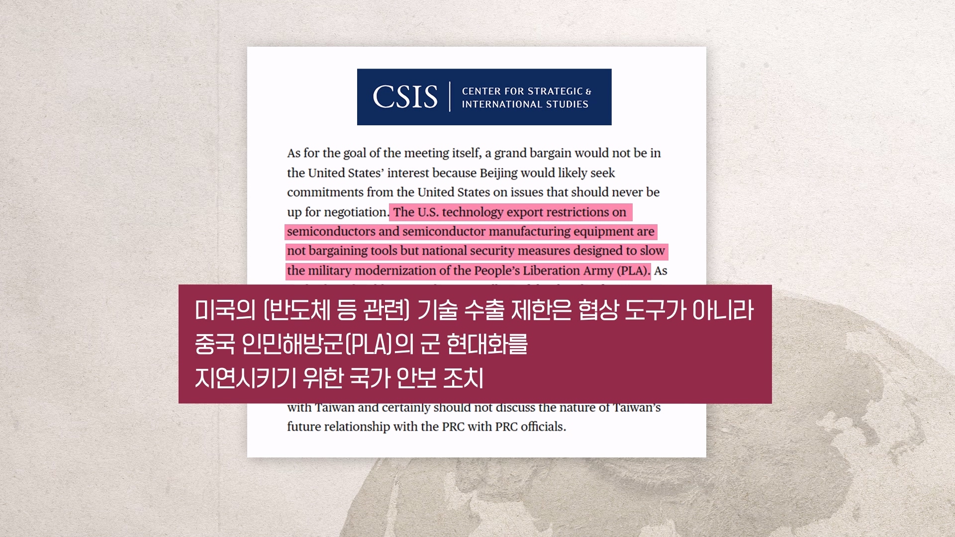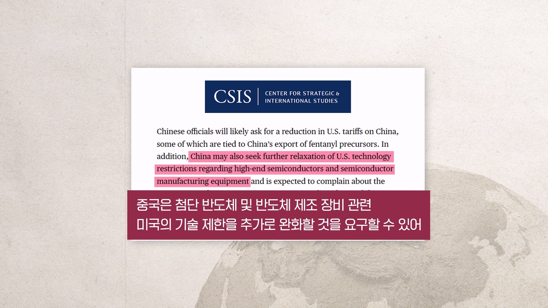 미국 전략국제문제연구소인 CSIS의 학자들은 이번 회담에서 중국이 첨단 반도체 및 반도체 제조 장비와 관련이 된 미국의 기술 제한을 추가로 완화할 것을 요구할 수 있다고 했는데요. 그렇지만 미국의 반도체 등 관련 기술 수출 제한은 협상 도구가 아니라 중국 인민해방군의 군 현대화를 지연시키기 위한 국가 안보 조치이기 때문에 미국이 양보할 수 없는 부분이다라고 주장했습니다.