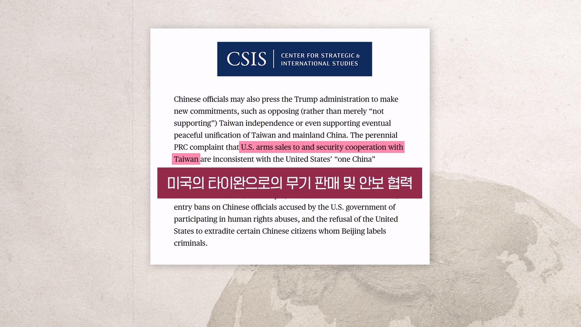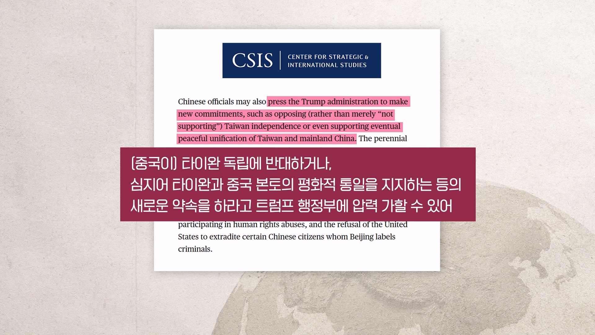 미국 전략국제문제연구소 CSIS는 중국이 타이완 독립에 반대하거나 심지어 타이완과 중국 본토의 평화적 통일을 지지하는 등의 새로운 약속을 하라고 트럼프 행정부에 압력을 가할 수도 있다고 하면서요. 미국이 타이완으로 무기를 판매하는 것 그리고 안보 협력을 하는 것 등에도 중국이 불만을 표할 수 있다고 분석했습니다.