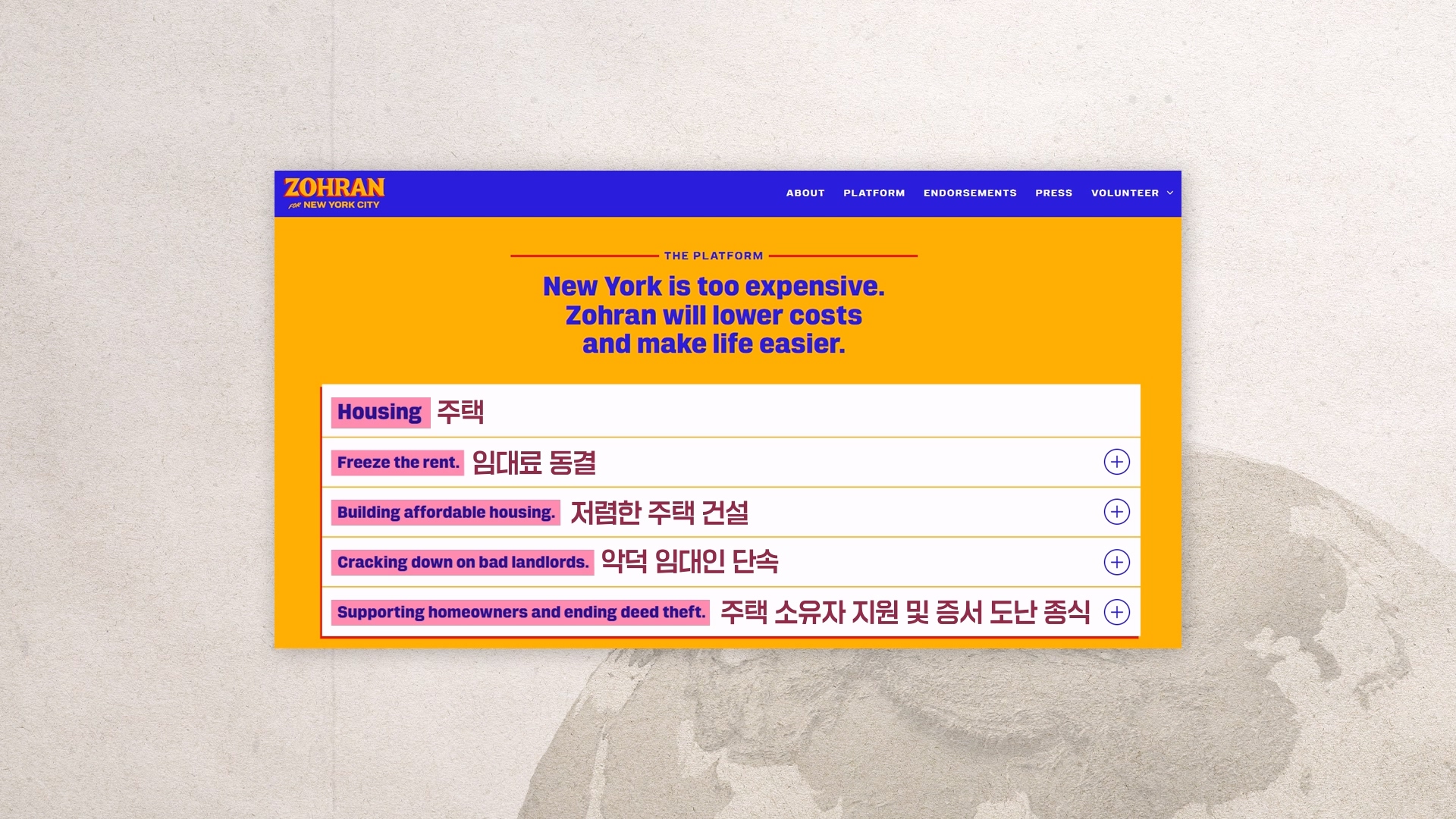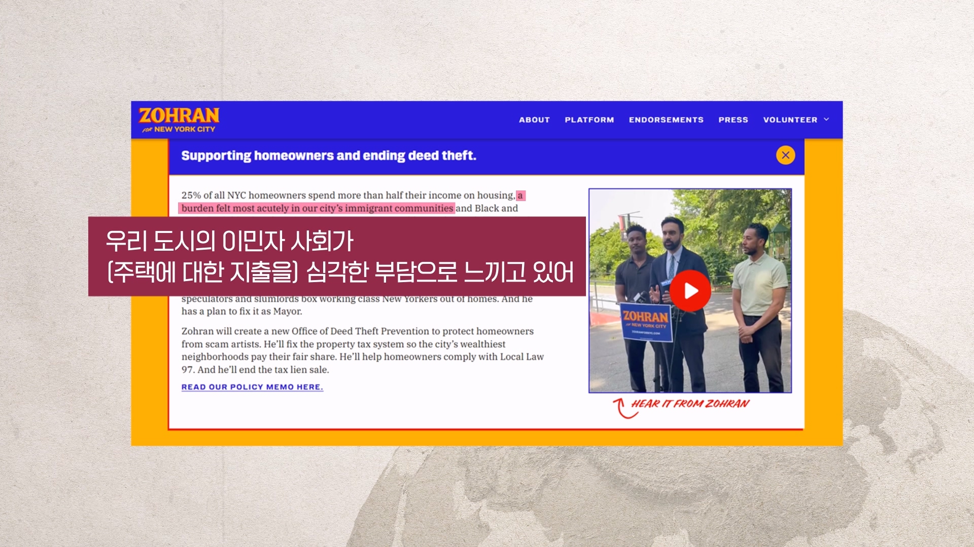 그리고 주택 관련 공약도요. 뉴욕의 이민자 사회가 주택에 대한 지출을 심각한 부담으로 느끼고 있다라는 말과 함께 내놓았고요.