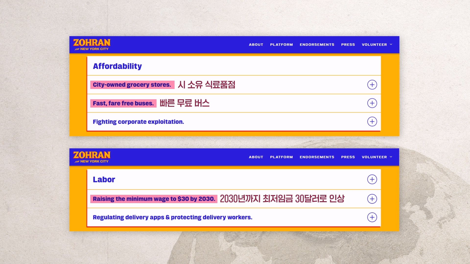가령 과거에 뉴욕시 택시 운전자들의 약 40%가 남아시아계이고, 노점상들의 50% 이상이 남아시아계이고, 또 뉴욕시 공립학교 학생의 약 38%가 무슬림이거나 유대인인데 그럼에도 불구하고 뉴욕시, 그리고 뉴욕주의 공립학교에서 종교적으로 허용되는 음식을 구하기가 어렵다, 이게 그동안의 뉴욕에서의 어떤 정치 담론에서는 핵심 의제로 거론된 바가 없었는데 이번에는 자신이 만약에 시장으로 취임을 하게 되면 많은 이민자들의 가정에서는 매일매일 겪어내는 이런 생활의 문제들을 핵심 쟁점으로 꺼내 들어서 이런 문제들을 풀어가겠다, 이러한 의지를 계속해서 표명을 했고 그걸 계속 강조를 함으로써 이런 부분들이 많은 이민자들로 하여금 공감을 얻고 또 변화에 대한 기대도 얻어낸 것이 아닌가, 이런 분석이 가능해 보입니다.