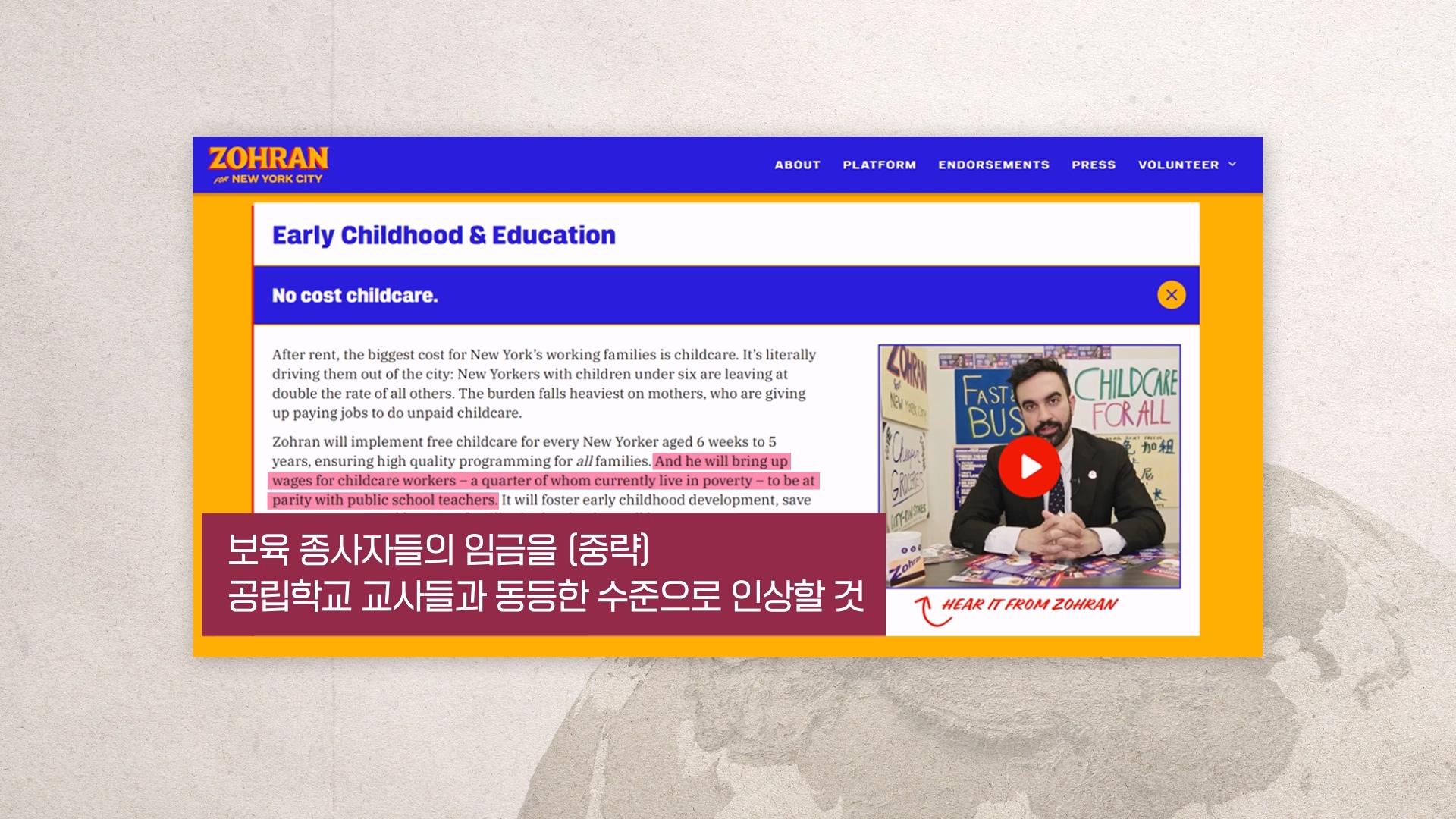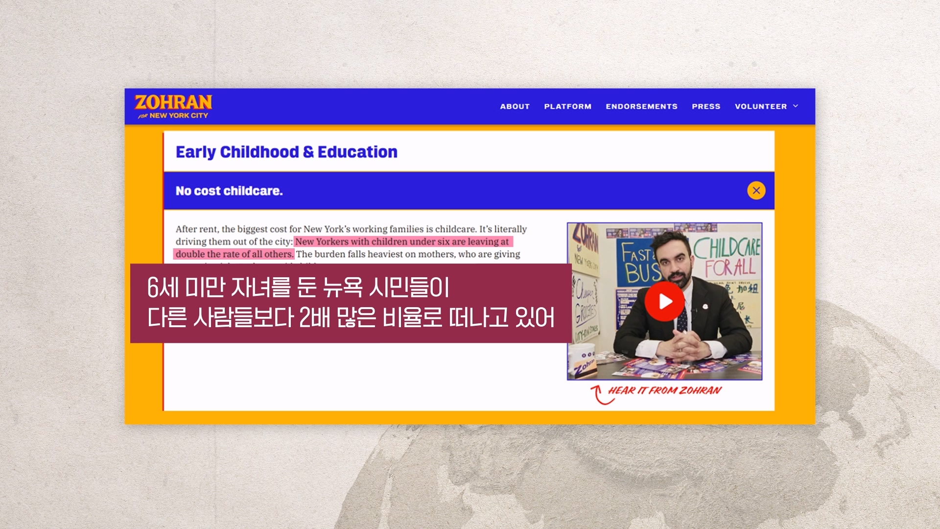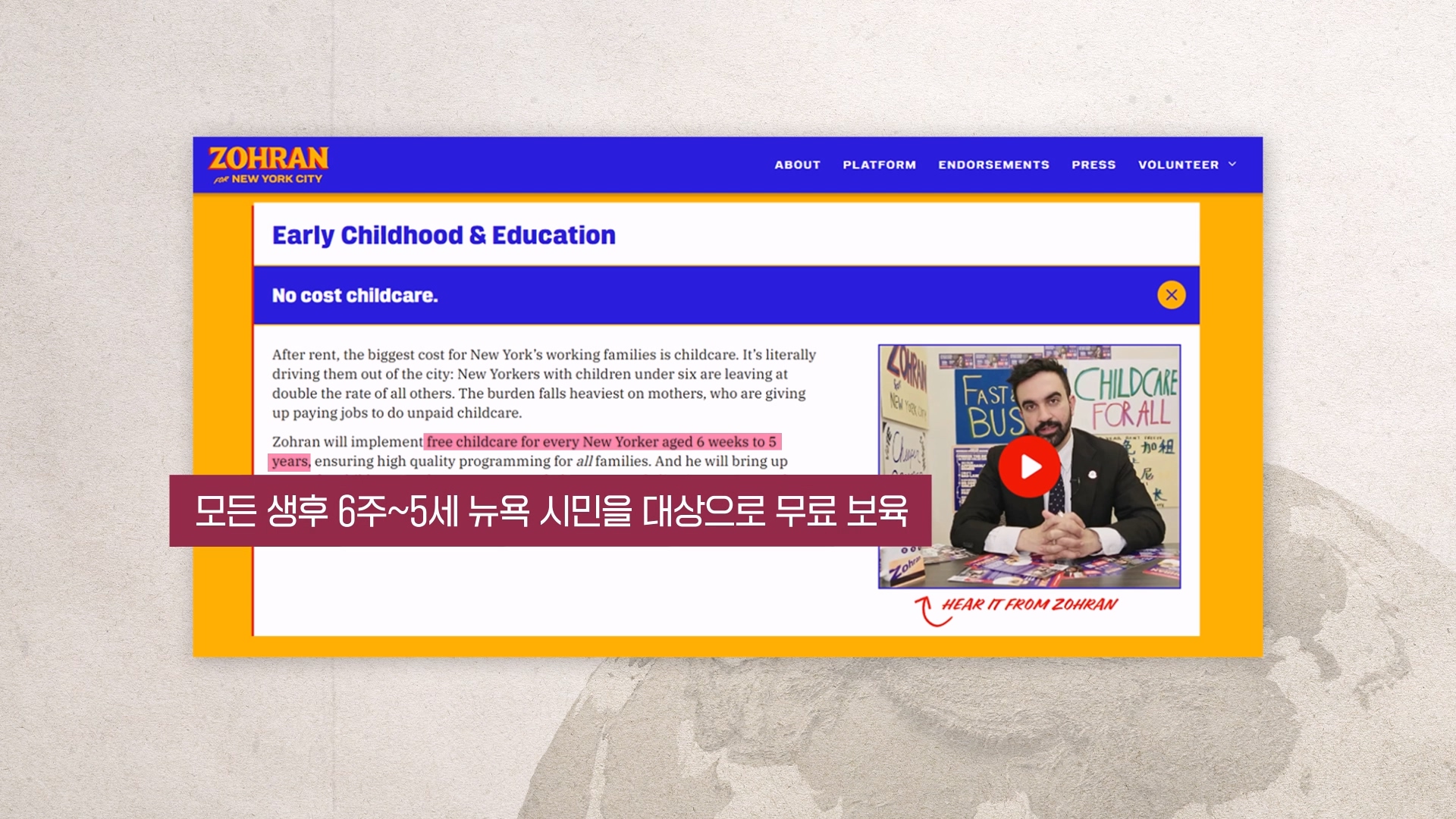 뿐만 아니라 교육 관련 공약도 있는데요. 6살 미만의 자녀를 둔 뉴욕 시민들이 다른 사람들보다 2배나 많은 비율로 도시를 떠나고 있음을 지적을 하면서, 생후 6주부터 5살까지 모든 뉴욕 시민들을 대상으로 무료 보육을 시행하겠다라고 했습니다.