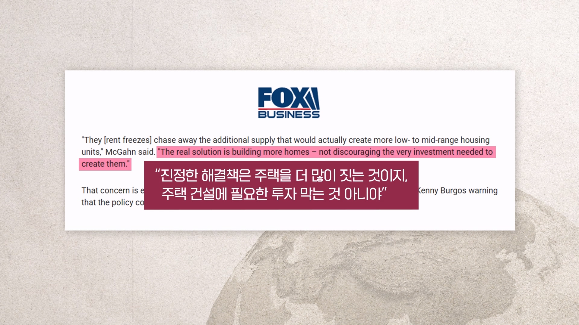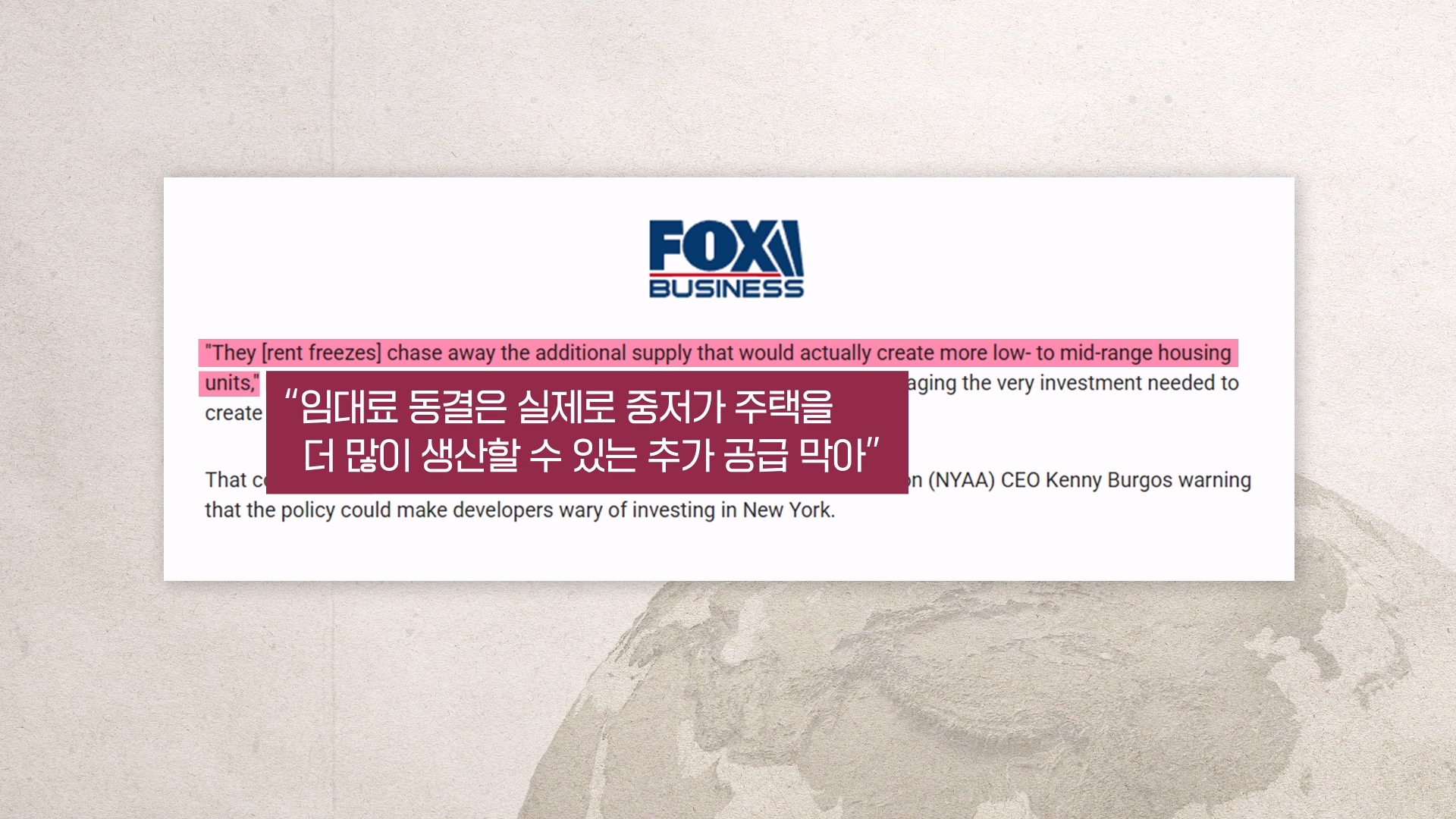 미국 폭스 비즈니스에 따르면 전미 부동산 중개인 협회(NAR)의 한 책임자는요. 임대료 동결은 실제로 중저가 주택을 더 많이 생산할 수 있는 추가 공급을 막는다, 진정한 해결책은 주택을 더 많이 짓는 것이지, 주택 건설에 필요한 투자를 막는 게 아니다라고 말했습니다.