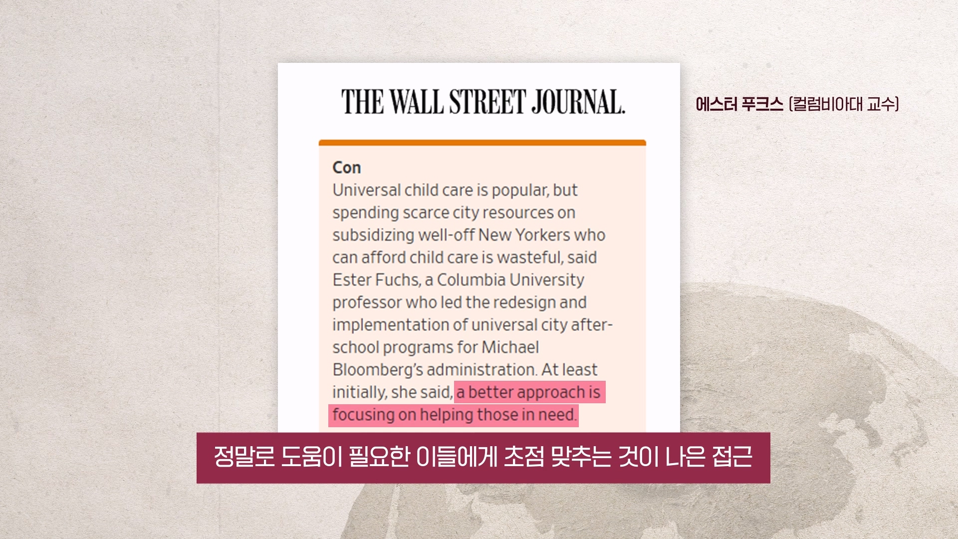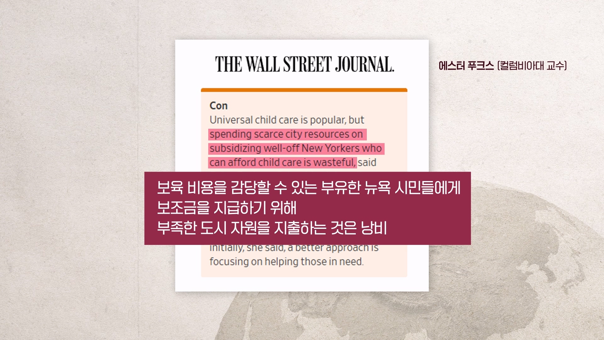 컬럼비아대의 한 교수는요. 보육 비용을 감당할 수 있는 부유한 뉴욕 시민들에게 보조금을 지급하기 위해서 부족한 도시 자원을 지출하는 건 낭비다라고 하면서, 정말로 도움이 필요한 이들에게 초점을 맞춰야 한다라고 지적하기도 했습니다.