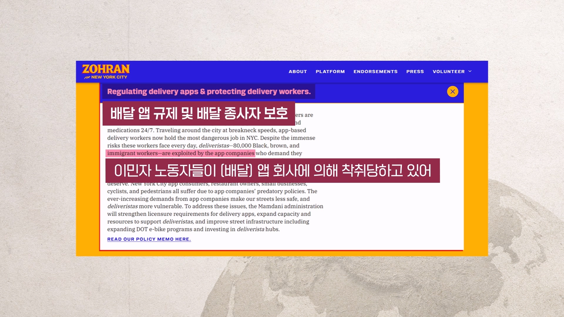 이민자들의 이민자 노동자들이 배달 앱 회사에 의해서 착취당하고 있다면서 배달 앱 규제 공약 역시 내세운 바가 있습니다.